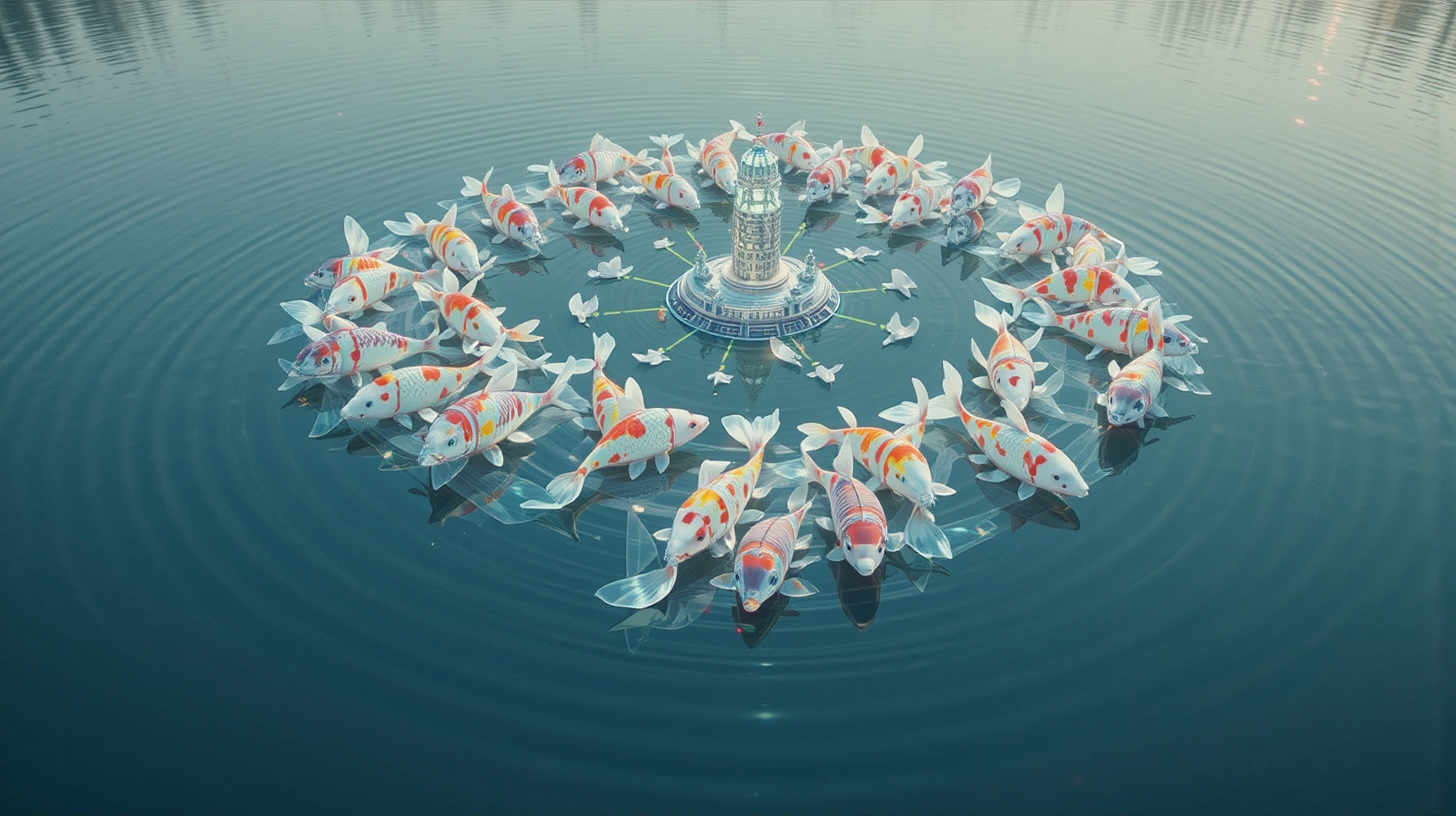 作图提示词:Aerial view of Xuanwu Lake center with holographic koi fish forming a 3D Nanjing topographic model. Translucent koi constantly morphing to reflect real-time ecological data, their colors indicating air quality and water indexes. The lake surface mirrors both real koi and holographic projections, with rainbow light spots dancing across water ripples. 90-degree vertical rotating shot showing perfect symmetry between physical reflections and data projections. The scene captures a futuristic yet serene ambiance, blending nature with advanced quantum technology.