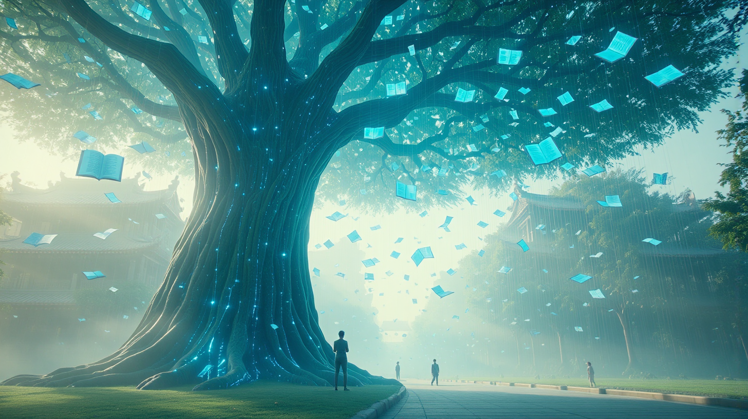 作图提示词:A towering phoenix tree trunk with pulsating blue quantum veins at Zhongshan Mausoleum’s Wutong Avenue, dawn light filtering through the canopy. Glowing book pages transformed from falling phoenix leaves float mid-air, displaying shifting ancient Nanjing maps. The entire tree-lined path is enveloped in an aurora-like curtain of data streams, with mist enhancing the mystical blue-green morning glow. Ultra-wide angle low shot capturing the data galaxy flowing inside the trunk as camera follows ascending luminous pages. Modern futuristic elements blend seamlessly with traditional Nanjing scenery, creating a harmonious fusion of past and future.