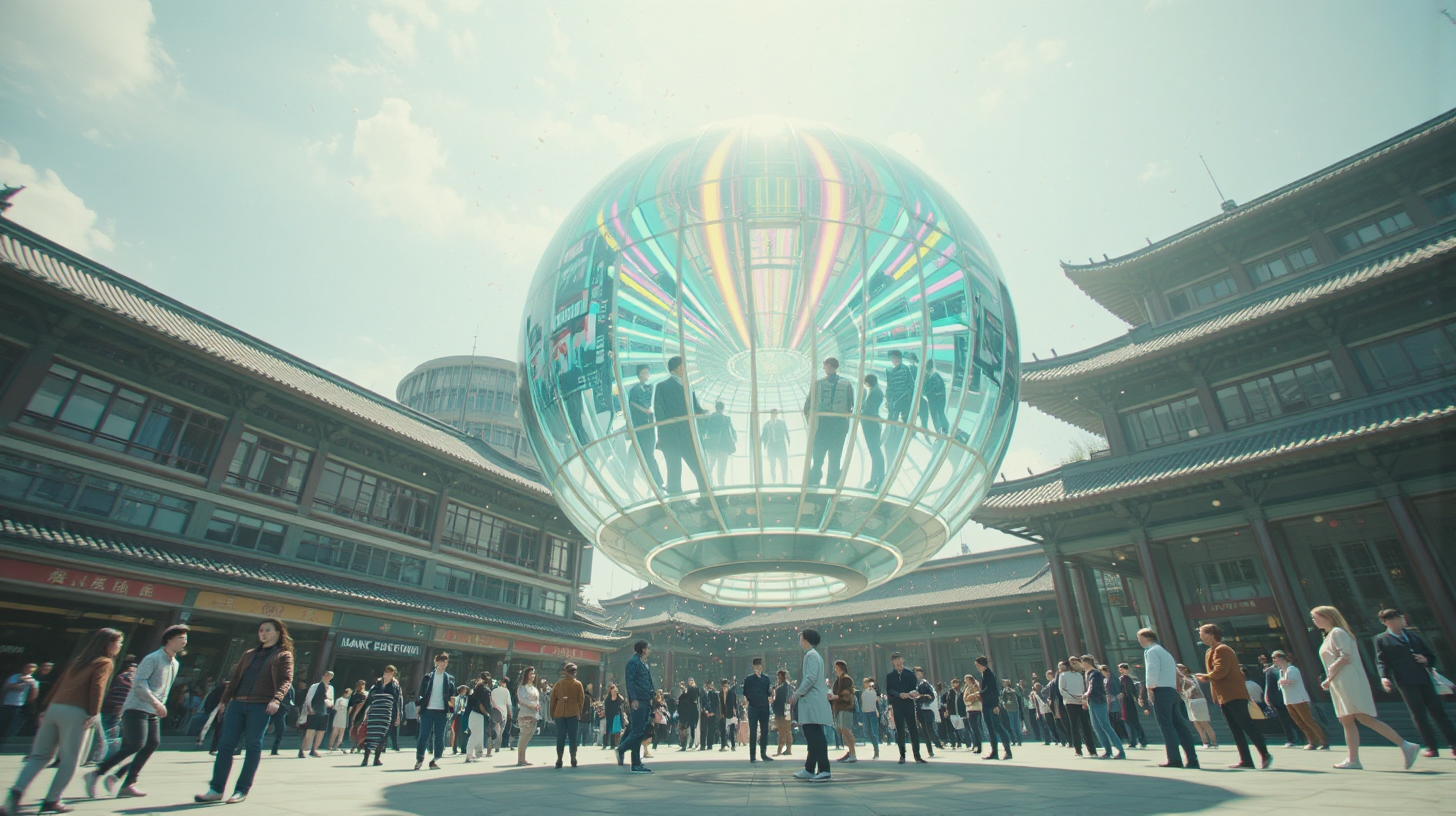作图提示词:Frontal low-angle shot of the levitating Tang Xianzu memory capsule in Fuzhou Square, its amorphous quantum-glass surface refracting sunlight into rainbow patterns across interacting citizens. Composition uses rule of thirds to balance the floating orb against traditional architecture, with cinematic volumetric lighting emphasizing the capsule’s anti-gravity field through particulate effects. Color grading emphasizes the contrast between warm human skin tones and cool holographic interfaces.