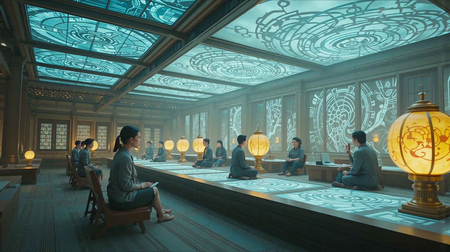 作图提示词:Dutch angle side view of the Eight Masters neural station, where pulsed optogenetic arrays project calligraphic skill-data streams between users’ temple implants. Lighting design uses practical sources - glowing Tang-style lanterns containing quantum processors - to create pools of warm illumination against cool neurofeedback visuals. Composition leads the eye along golden ratio spirals from traditional architectural details to futuristic interface points.