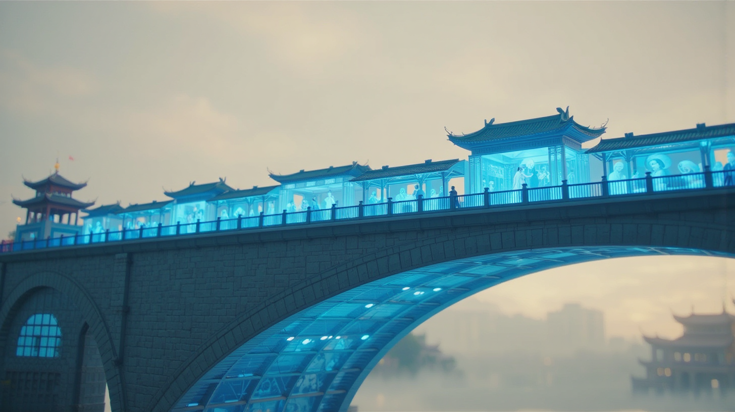 作图提示词:Side profile of Wenchang Bridge’s transformed neural-interface structure, where holographic projectors embedded in Qing-style balustrades cast dynamic scenes from ‘The Peony Pavilion’ in volumetric blue light. Shot with tilt-shift lens to emphasize the bridge’s dual nature - traditional stone arches below supporting translucent graphene walkways above. Cool cyberpunk lighting contrasts with warm cultural projections, using complementary color theory to heighten visual tension.