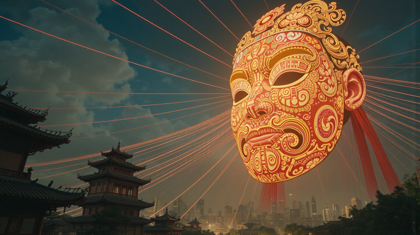 作图提示词:A colossal traditional Chinese opera mask formed by millions of neural imprints floats in the clouds above Fuzhou city during the annual Brainwave Resonance Festival. The giant holographic face displays ever-changing Nuo opera patterns synchronized with the cultural rhythm of the city, casting colorful reflections on the ancient architecture below. Low-angle shot emphasizing the mask’s majestic scale against the night sky, with streaks of data streams connecting it to neural interface hubs across the city. Vibrant reds and golds dominate the color scheme, creating a festive and awe-inspiring atmosphere. The scene captures a futuristic celebration where advanced technology and traditional Chinese culture merge, set in a high-tech future era.