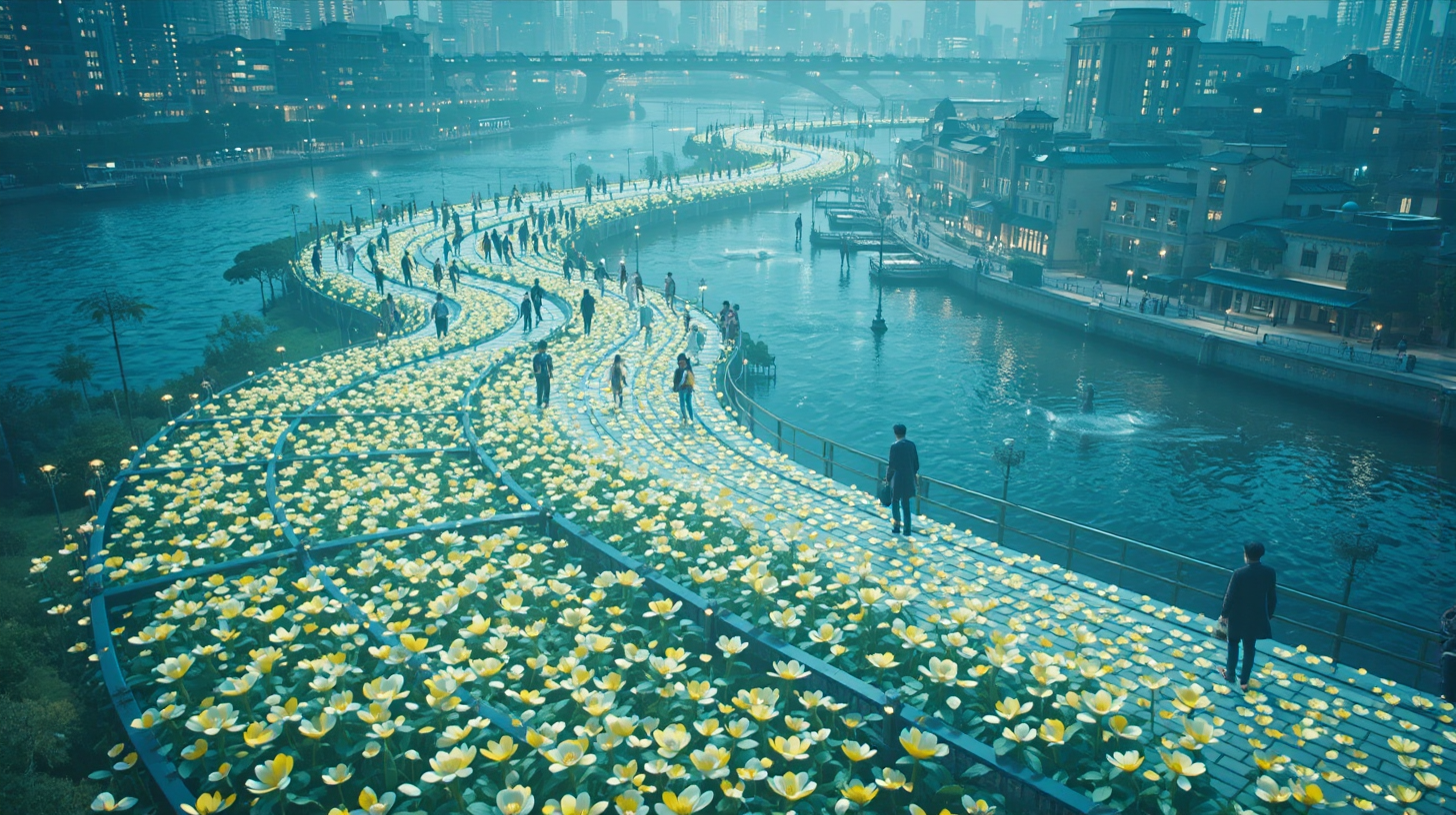 作图提示词:A futuristic riverside promenade at night in Fuzhou, Jiangxi, China, glowing with soft ambient light from ecological simulators embedded in the pathway. Digital rapeseed flowers bloom beneath the feet of walking citizens, creating a trail of luminous petals. Aerial view capturing the winding light river effect of the promenade through the cityscape, with traditional Chinese architecture silhouetted against the night sky. Color palette of deep blues and electric yellows, with a serene yet magical mood. Modern futuristic elements blending with traditional Chinese aesthetics, set in a near-future era where technology and nature coexist harmoniously.