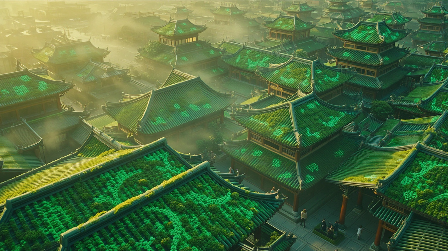 作图提示词:Aerial view of Fuzhou’s ancient architectural complex at sunrise, where bioluminescent quantum moss tiles pulse with emerald green cybernetic patterns, their nanotech moisture-regulation systems creating prismatic vapor halos around traditional curved rooftops. Ultra-wide cinematic composition with dynamic symmetry, using golden hour backlighting to create depth through atmospheric perspective, while maintaining vibrant Jiangxi color palette of vermilion pillars against celadon roofs.