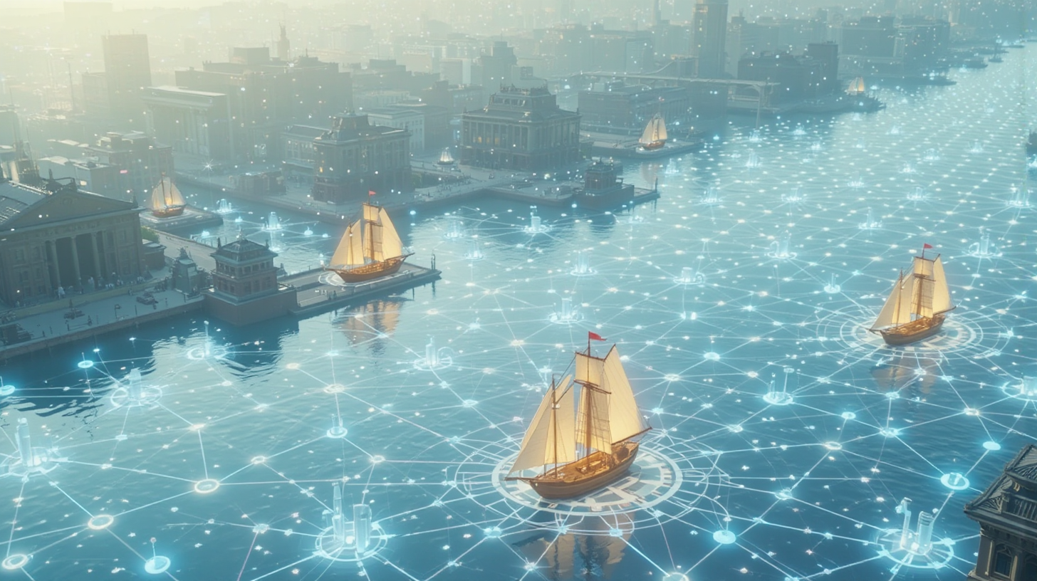 描述:晨曦刚吻上运河的水面,无数光点便从涟漪中苏醒,织成一张流淌的星链网络。漕运码头的青石板缝里,全息投影的古商船正缓缓升起,褪色的帆布兜住第一缕金光,与银灰色的量子运输艇在半空交错。水面像被打翻的碎金盒,每道波纹都在重复着千年漕运的号子与未来引擎的轻鸣,让这条曾载满粮米的航道,如今载着时光往复穿梭。