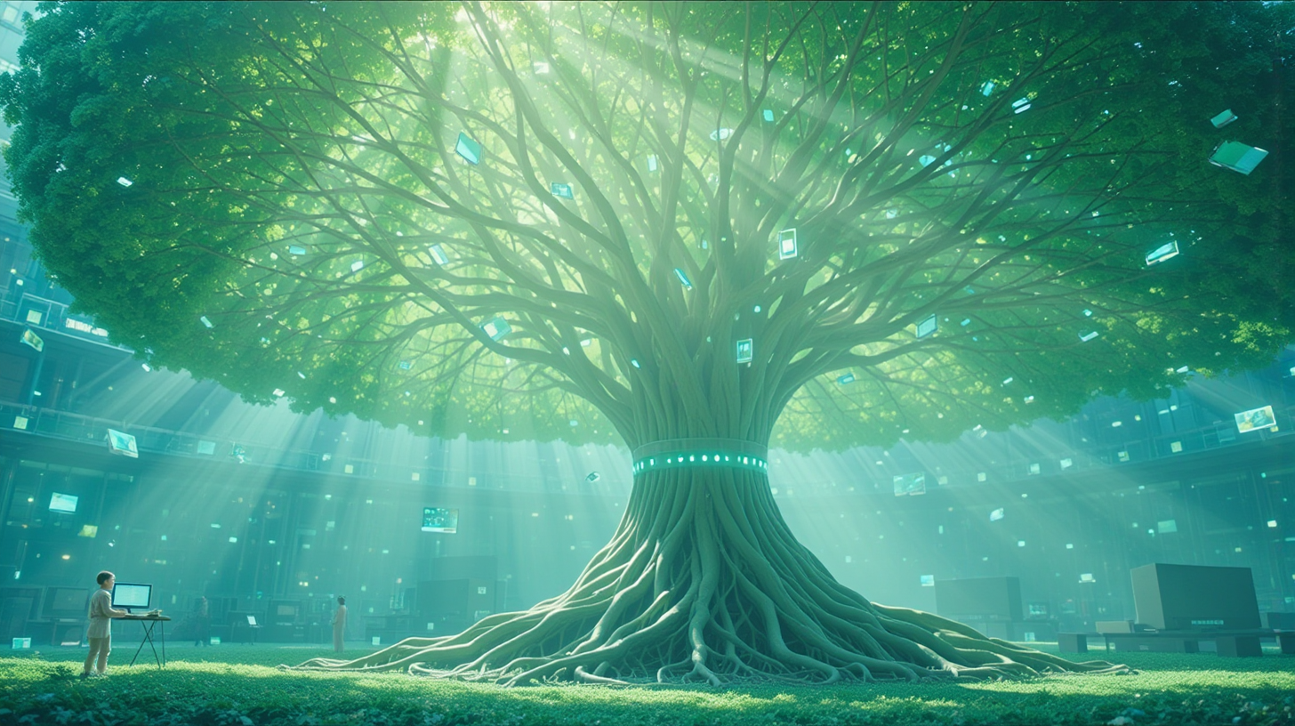 作图提示词:A majestic thousand-year-old ginkgo tree with bioluminescent roots intertwined with underground quantum supercomputers, forming an advanced biological data hub. The scene glows with an ethereal cyan-veridian light. Sunbeams pierce the dense canopy in precise god-ray patterns, illuminating floating data particles in the air. Shot with a macro tilt-shift lens at f/2.8 to emphasize the intricate root-computer interfaces, using cool-toned cinematic lighting with subtle chromatic aberration for a sci-fi ambiance.