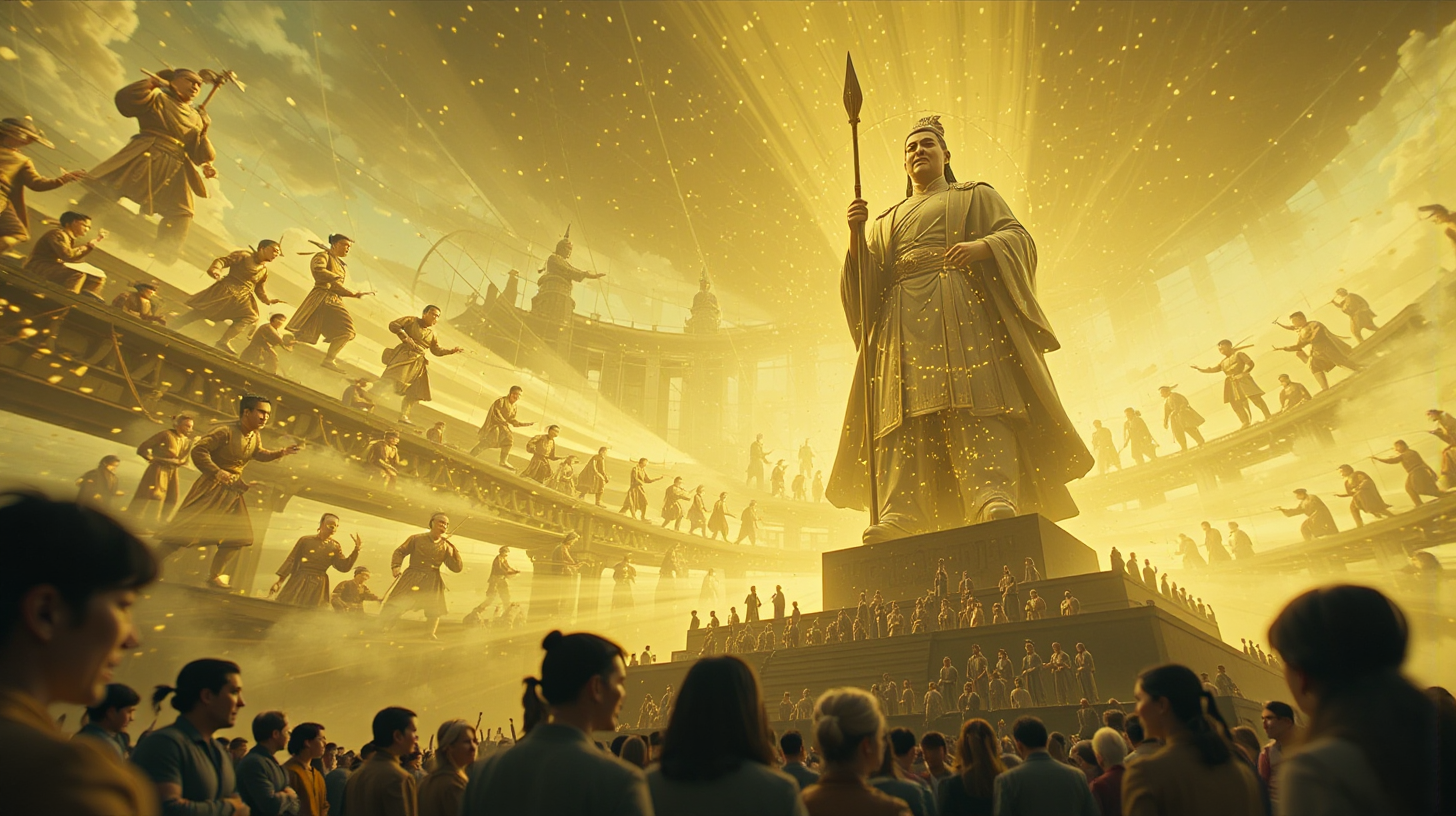 作图提示词:A majestic statue of Xiang Yu stands tall, his overlord spear transforming into a light particle reorganizer that projects vivid scenes of the Chu-Han contention across the sky. The projections use photonic technology to recreate historical accuracy with cinematic quality. Dramatic lighting with golden particles illuminates awestruck citizens below, their faces bathed in the glow of history. The composition uses a low-angle shot to emphasize the statue’s grandeur against the swirling historical visuals. Early 22nd century holographic technology with emotional resonance algorithms.