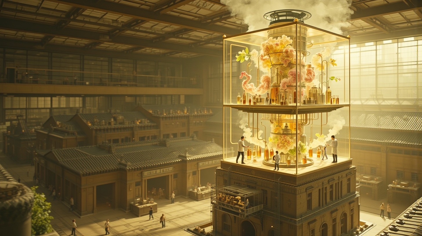 作图提示词:A towering molecular brewing installation floats above Yanghe Distillery’s preserved foundations, its transparent chambers revealing precise flavor synthesis in progress. Retired master brewers in smart exo-gloves guide nano-assemblers with practiced gestures, creating bespoke aromas that materialize as chromatic vapor sculptures. Warm golden lighting highlights the interplay between traditional craftsmanship and precision technology, with shallow depth of field focusing attention on the central brewing process. Late 22nd century gastronomic tech with artisanal preservation.