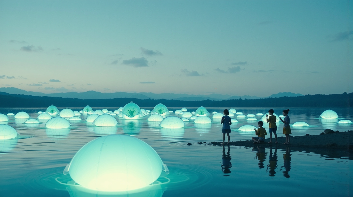 作图提示词:A serene lake at dusk features transparent ecological pods rising from the water, their quantum algae cores converting pollution into pulsing bioluminescent energy. The pods arrange in fractal patterns across the water’s surface, casting a soft blue-green glow. On shore, children interact with the system through gesture controls, their silhouettes framed against the luminous display. The scene uses reflective water surfaces to double the visual impact, with cool tones contrasting warm human elements. Mid-22nd century clean energy technology with organic interfaces.