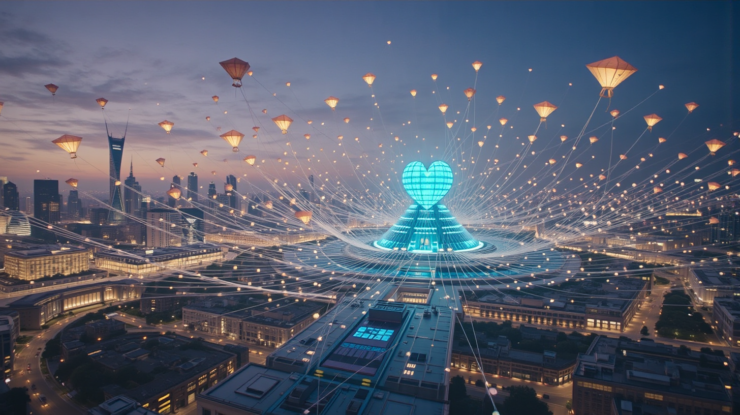 作图提示词:A sweeping aerial view of Neo-Suqian’s skyline at twilight, where smart-building facades dynamically unfold fractal light patterns in synchronized waves. In the quantum-lit central plaza, intelligent kites woven with flexible OLED displays visualize wishes as they self-organize into a pulsating neural network formation, their trajectories algorithmically converging to materialize a colossal hologram of the ‘Heart of Suqian’ monument. Captured with a 16mm lens at f/11 for deep focus, the composition balances warm amber city lights against a cool electric-blue hologram, with long exposure capturing luminous kite trails. High dynamic range preserves details in the darkening violet sky and radiant urban landscape.