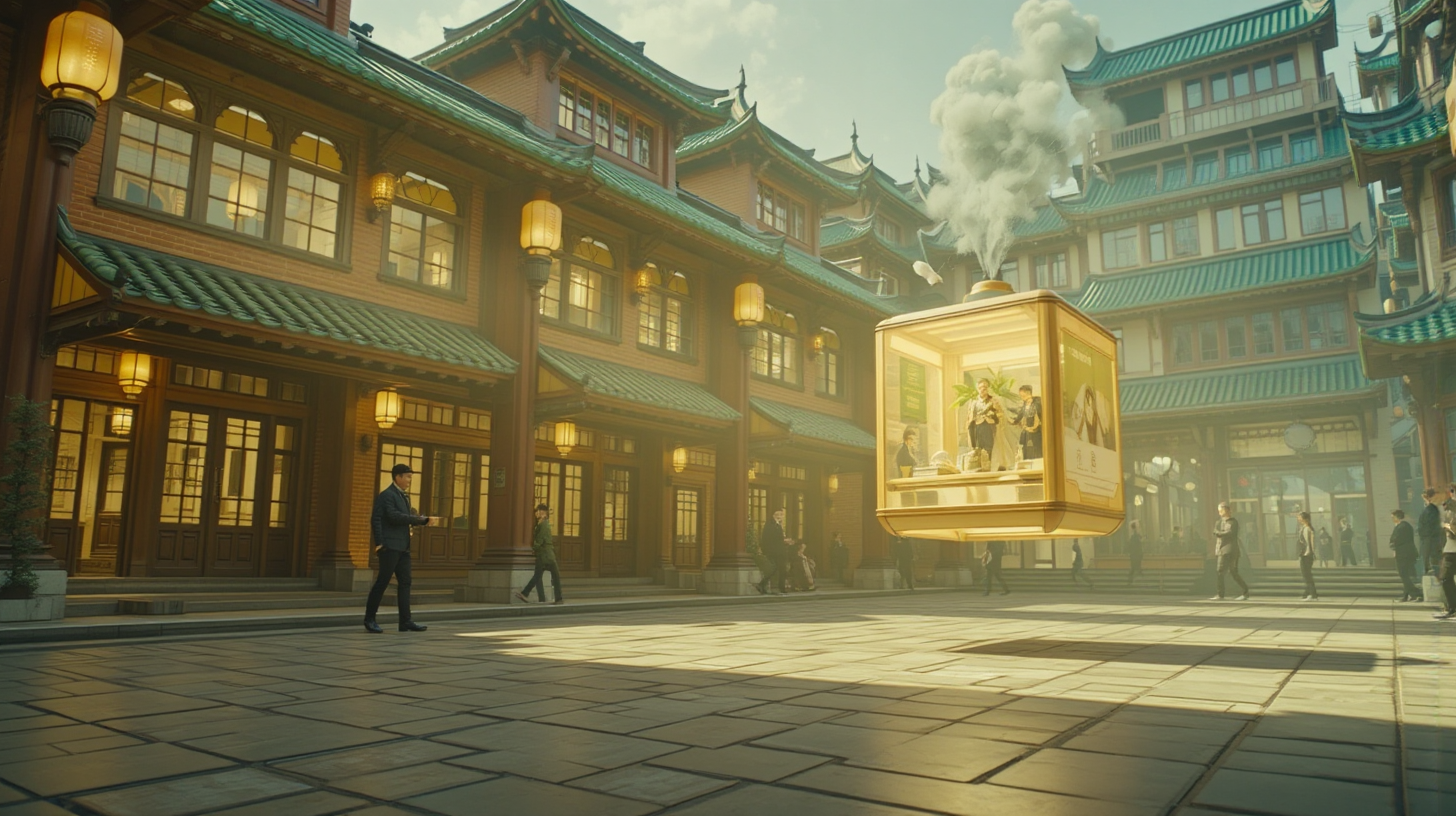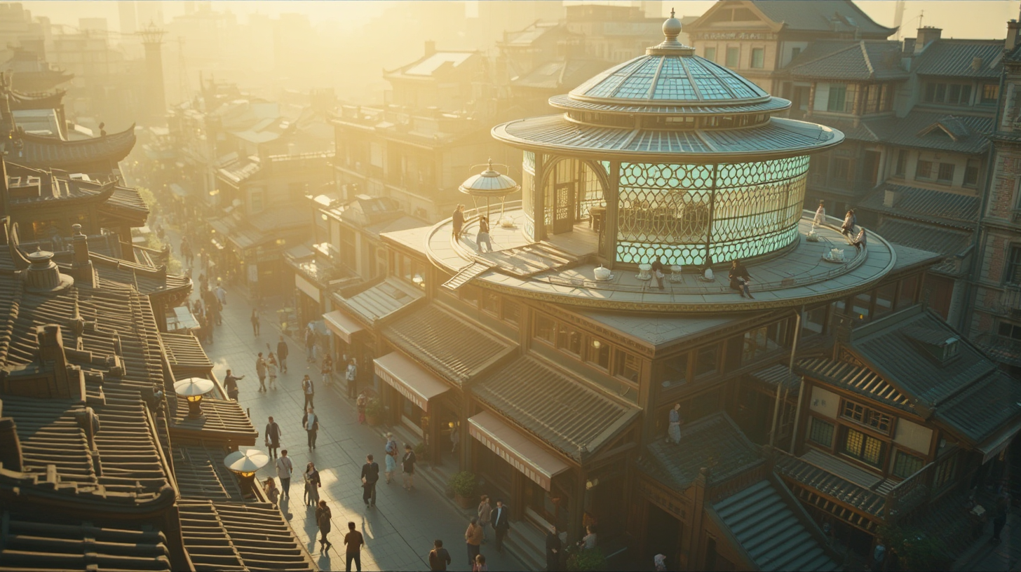 作图提示词:A futuristic Cantonese tea house with quantum-enhanced architecture floating above Guangzhou’s historic arcade streets at dawn, its surfaces adorned with dynamic holographic Lingnan-style lattice patterns. Magnetic levitation tea drones navigate between floating platforms, casting soft golden morning light that creates long shadows on the ancient streets below. Ultra-wide low-angle shot with shallow depth of field, emphasizing the contrast between traditional architectural details and glowing quantum elements, using warm sunrise color palette with cool tech accents.