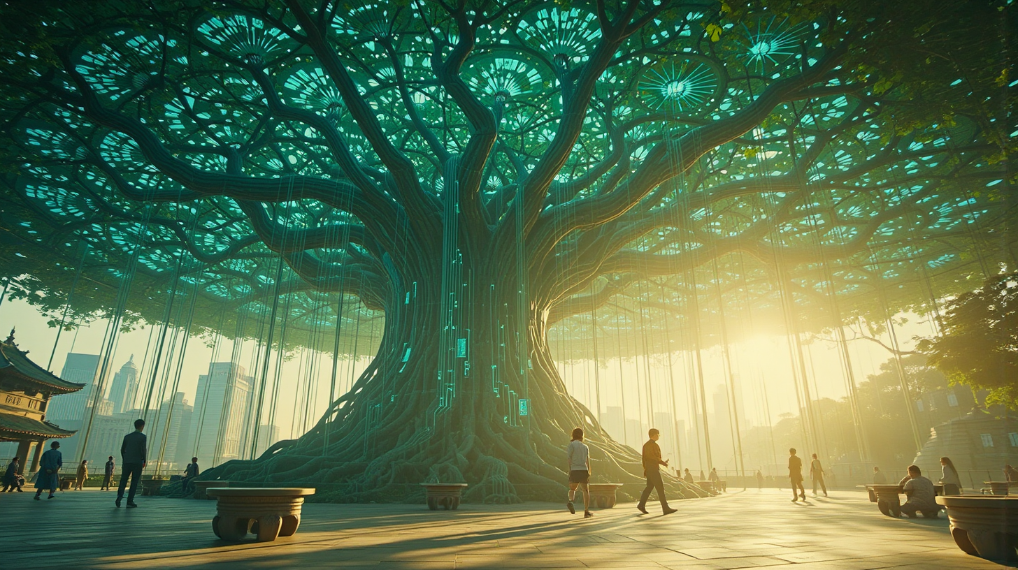 描述:千年古榕的虬根在地下织成银色网络,每一条根须都是跳动的电路,在泥土里写着城市的代码。树干上,市民脑波凝成的粤语诗正缓缓流淌,光纹如书法般飘逸,把“饮啖茶”的闲逸、“得闲聚”的温暖,都译成了可见的温柔。树冠在晨光中舒展成绿色穹顶,将早茶铺子飘来的茉莉香、蒸笼气,都酿成治愈的数据脉冲,轻轻洒向全城。树下石凳上,光影斑驳,仿佛能听见古树与芯片的低语,诉说着自然与科技的千年约定。