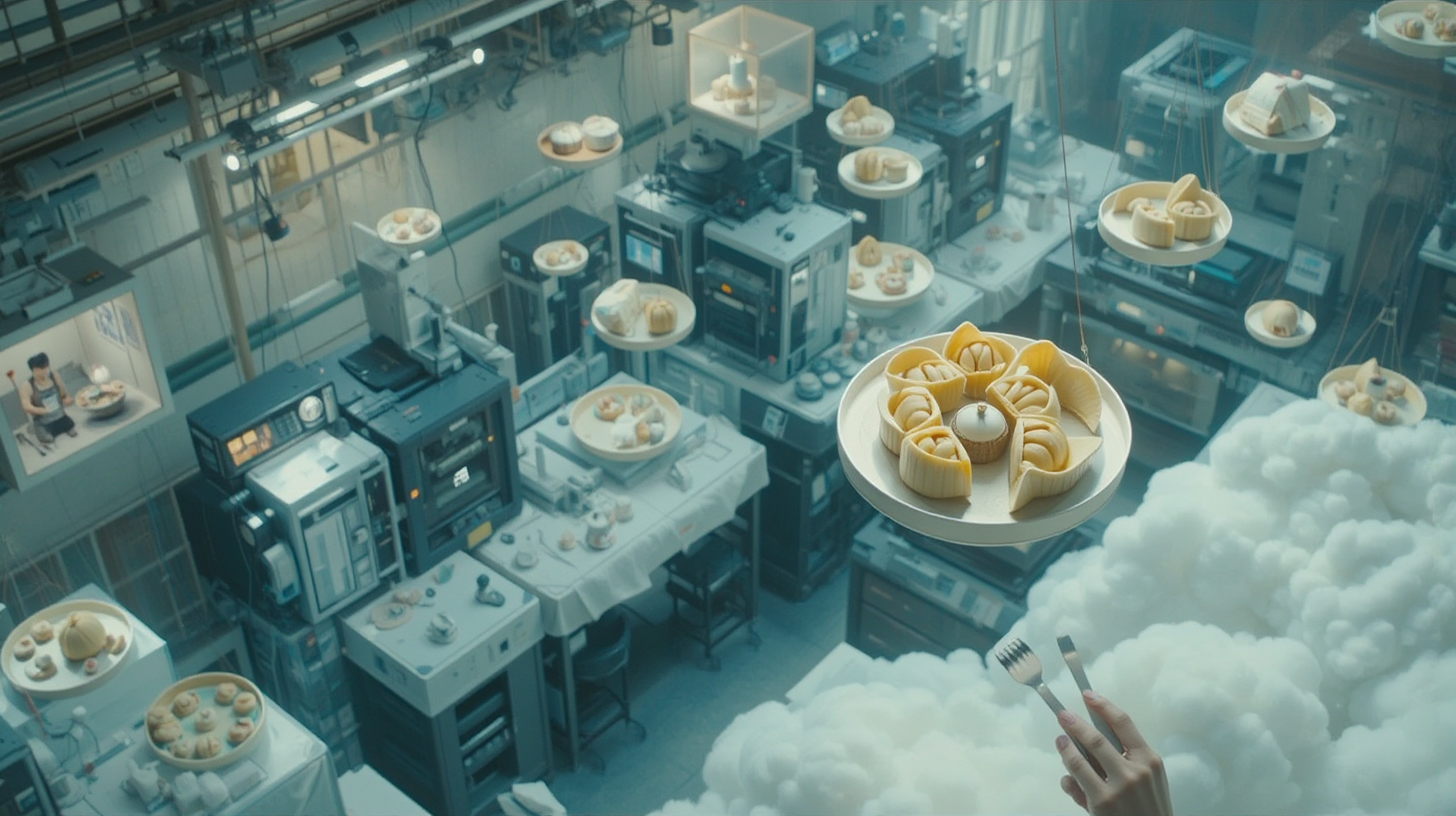 作图提示词:An expansive cloud workshop atop Guangzhou’s landmark quantum-computing tower, where advanced 3D printers merge ceramic artistry with molecular gastronomy. Precision laser systems guide nano-pigments as they form intricate, edible dim sum sculptures mid-air, suspended in anti-gravity fields. Traditional kiln techniques are reimagined through quantum stabilization chambers. High-angle shot with macro lens details, using clinical white light for the workspaces contrasted with warm ambient lighting on the edible artworks, creating visual tension between technological precision and organic cultural forms.