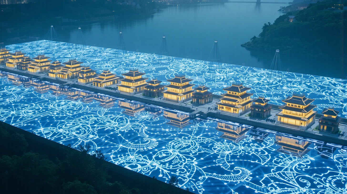 作图提示词:The Pearl River at twilight, its surface alive with a shimmering network of self-organizing nano-optical fibers that purify water while converting flow data into intricate light projections of Lingnan architectural motifs. Holographic rooftops of quantum-rendered traditional buildings reflect perfectly on the calm water, creating symmetrical compositions of light and heritage. Aerial drone shot with long exposure, capturing the luminous data patterns in a cool blue-violet color scheme contrasted with warm gold projections, using rule-of-thirds composition for balanced technological and natural elements.