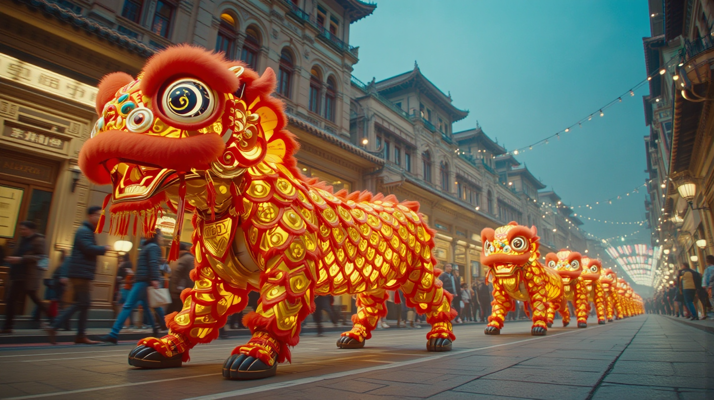 作图提示词:A vibrant cultural parade on Shangxiajiu Pedestrian Street featuring nano-enhanced mechanical lion dance performers. The lion’s head projects dynamic holograms of Lingnan cultural motifs while its articulated tail unfolds photon-collecting scales that shimmer with energy. Historic arcade buildings serve as canvases for responsive light projections that interact with the procession. Horizontal tracking shot with medium telephoto lens, capturing motion blur of dancers against sharp architectural details, using high-contrast lighting to emphasize the fusion of traditional red/gold color schemes with futuristic neon accents.
