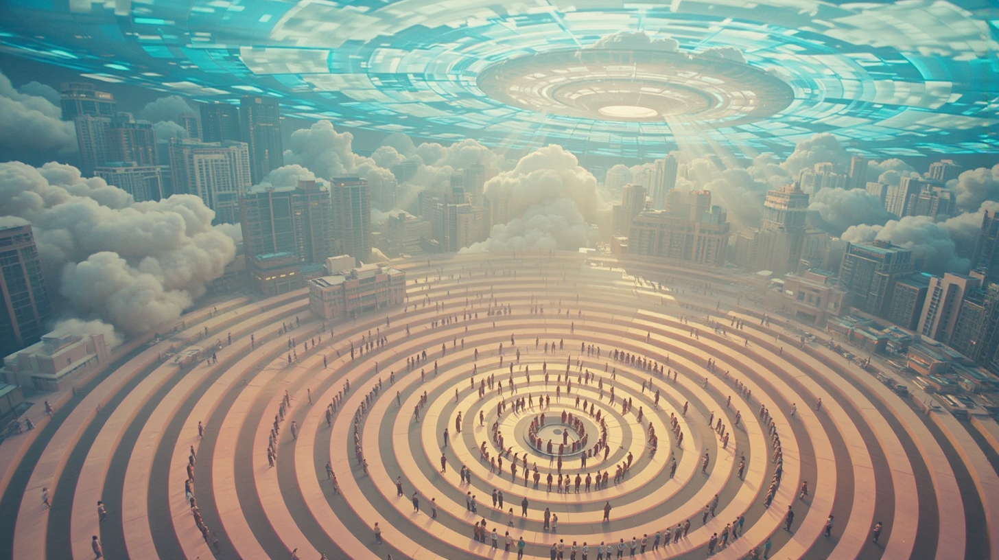 作图提示词:A breathtaking aerial view of Langfang city during the ‘Neural Offline Day’ phenomenon, captured from 1500m altitude with a tilt-shift 45mm lens. The collective consciousness manifests as a holographic cloud projection spanning 3km, displaying real-time emotional patterns (mapped to HSB color space). Below, adapted Zhuma opera performers on floating platforms create concentric movement patterns. The spectral wall system emits bioluminescent gradients (luminance 1500cd/m²). Composition follows the golden spiral with the cloud vortex as focal point. Shot at f/11 with HDR blending to capture the full dynamic range. Color temperature transitions from dawn pastels (4000K) to intense emotional flares (up to 10000K for brief peaks).