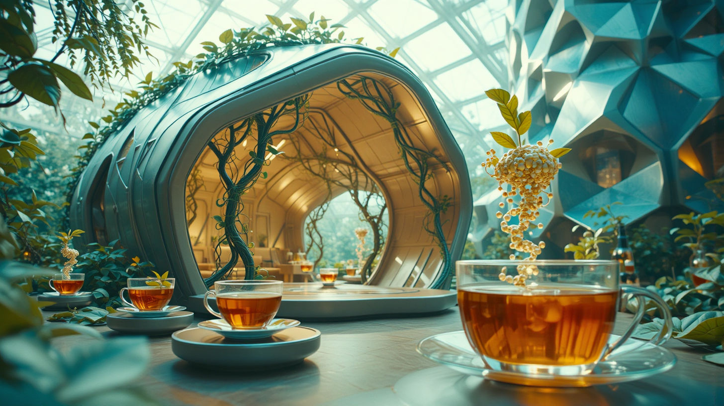 作图提示词:A futuristic tea pavilion constructed from biomechanical vines with phototropic responsiveness, adjacent to a topological hub tower with morphing fractal geometry. The structure’s metallic surfaces (hexcode #C0BABC) exhibit variable reflectance properties. Floating anti-gravitational tea sets demonstrate nanotech infusion processes, captured at the exact moment of molecular transformation. Composition uses rule of thirds with the pavilion at the intersection point. Lighting combines warm amber (2800K) interior glow with cool daylight (5600K) reflections. Shot at 85mm f/4 with selective focus highlighting the tea transformation process, while maintaining detail in both organic and engineered elements.