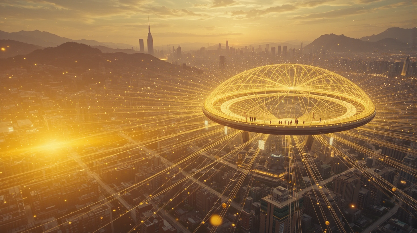 作图提示词:A breathtaking sunset scene over Langfang city, where a massive quantum kite unfolds into a star-ring shaped particle collider observation platform. The kite strings transmit neural pulses, connecting to the city’s Civilization Archives. Golden particles swirl around the structure, forming a glowing crown above the city. Children’s neural impulses travel along the strings, contributing to the topological blueprint of tomorrow’s Langfang. Ultra-wide aerial view, warm golden and violet color palette, futuristic yet poetic atmosphere, highly detailed sci-fi landscape.