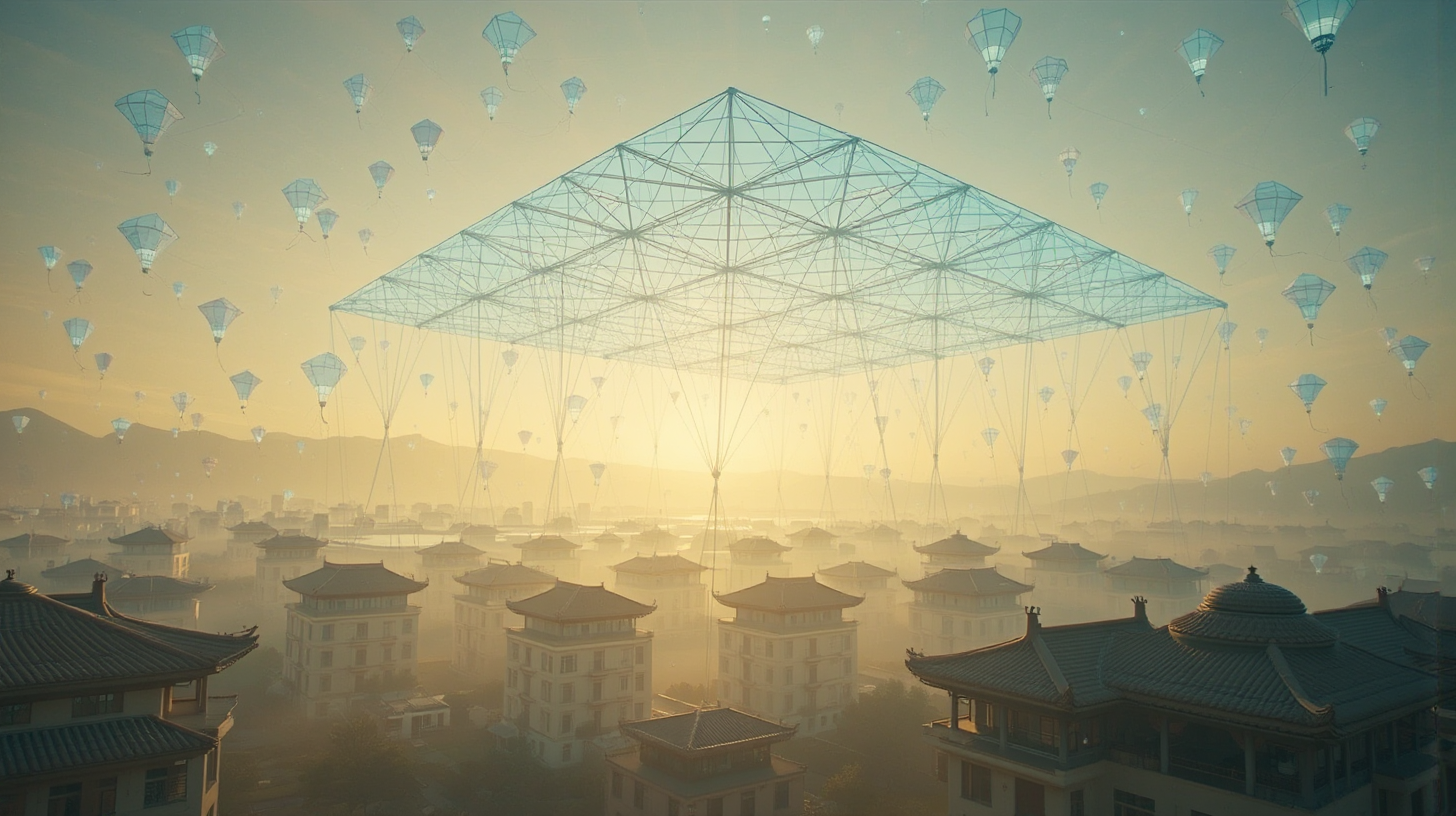 描述:晨光如融化的金子般淌过廊坊的天际线,无数全息粒子凝成的风筝正舒展着几何羽翼。这些由市民心底愿望驱动的发光体,在晨雾中勾勒出流动的星图,每一道粒子轨迹都藏着生活的细碎期盼。地下的量子网络如隐形的脉络,将创意包裹顺着风筝的牵引送往模块化公寓,传统歇山顶的曲线在粒子光芒中若隐若现,仿佛古老的燕赵大地正托举着一场温柔的科技梦境。