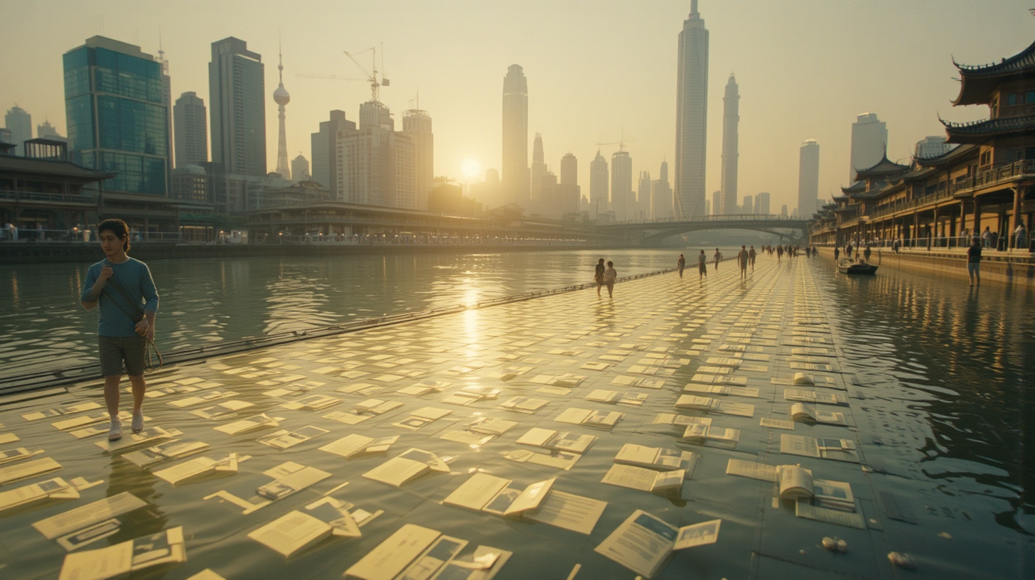作图提示词:A futuristic scene of the ancient Grand Canal in Langfang, China, transformed into a ‘Water Pattern Library’ by advanced nanobots. The water surface ripples with glowing text and intricate patterns formed by nanobots, activating holographic projections of Ming and Qing merchant guilds when touched. The setting sun casts golden reflections on the water, contrasting with the modern skyline in the background. Cinematic lighting, ultra-wide shot, vibrant colors, futuristic yet traditional atmosphere, blending quantum logistics with historical trade routes.
