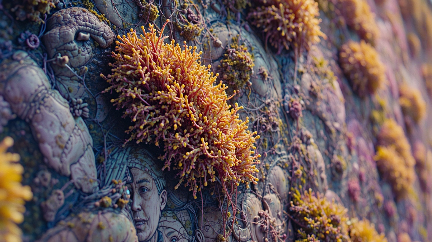 作图提示词:An extreme close-up of quantum moss (resolution 8k) dynamically reconstructing Yongle Palace murals with sub-micron precision. Laser guidance systems (wavelength 532nm) etch new cultural patterns with surgical accuracy. The scene captures the phase transition between traditional mineral pigments and quantum luminescence (CIE x=0.32, y=0.45). Framed as a centered macro composition with parallel projection. Lighting combines directional museum-grade LED (CRI>98) with particle self-illumination. Shot at 2:1 magnification ratio, f/16 for maximum depth of field, with focus stacking to maintain detail across the entire mural surface. Color spectrum ranges from ancient vermilion (#E34234) to quantum violet (#8F00FF).