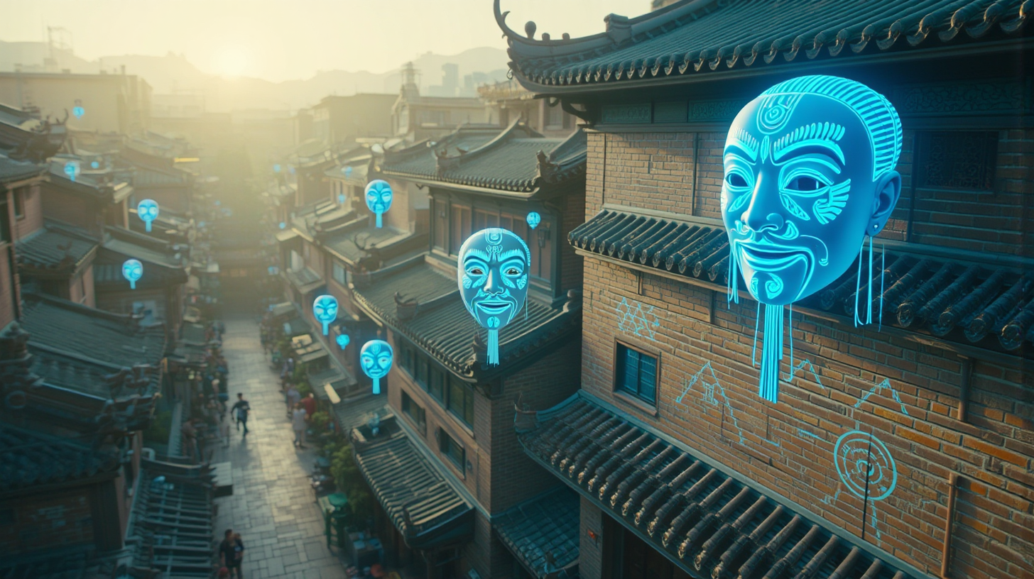 描述:晨光如碎金般穿透胡同的灰砖青瓦,那些沉淀了六百年岁月的砖瓦表面,正流转着幽蓝的量子纹路,像活过来的古老图腾。屋檐下,全息京剧脸谱正随着晨风轻轻旋转,红脸的关公、白脸的曹操在光影中交替变幻,与地面穿梭的智能清洁机器人共舞。细微的电子嗡鸣混着机器人滚轮碾过青石板的声响,让这条胡同既带着老北京的魂,又跳动着未来的脉搏。