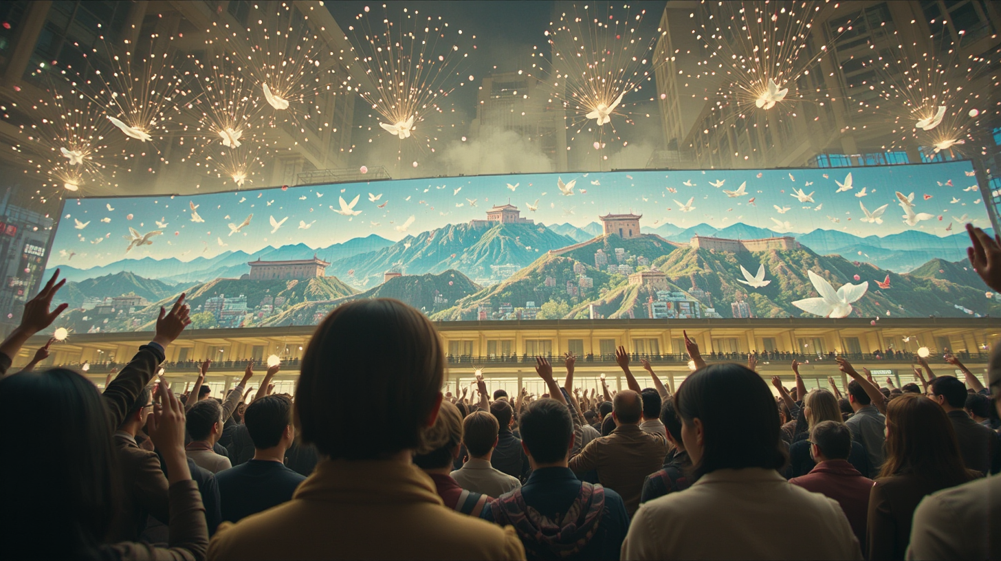 作图提示词:A grand National Day celebration in future Beijing, where smart building facades project an immersive holographic mural of the Great Wall spanning the skyline. Citizens launch bio-electric fireworks that coalesce into luminous dove formations in the stratosphere. Captured from a low-angle wide shot with a 16mm lens to emphasize scale, the scene features dynamic lighting where firework bursts (in crimson, cobalt and gold) illuminate the crowd’s upturned faces. The composition uses leading lines of building architecture to draw the eye toward the central holographic display, with atmospheric perspective enhancing depth. Color grading emphasizes rich saturated tones against the inky night sky, with specular highlights from floating nano-light orbs.