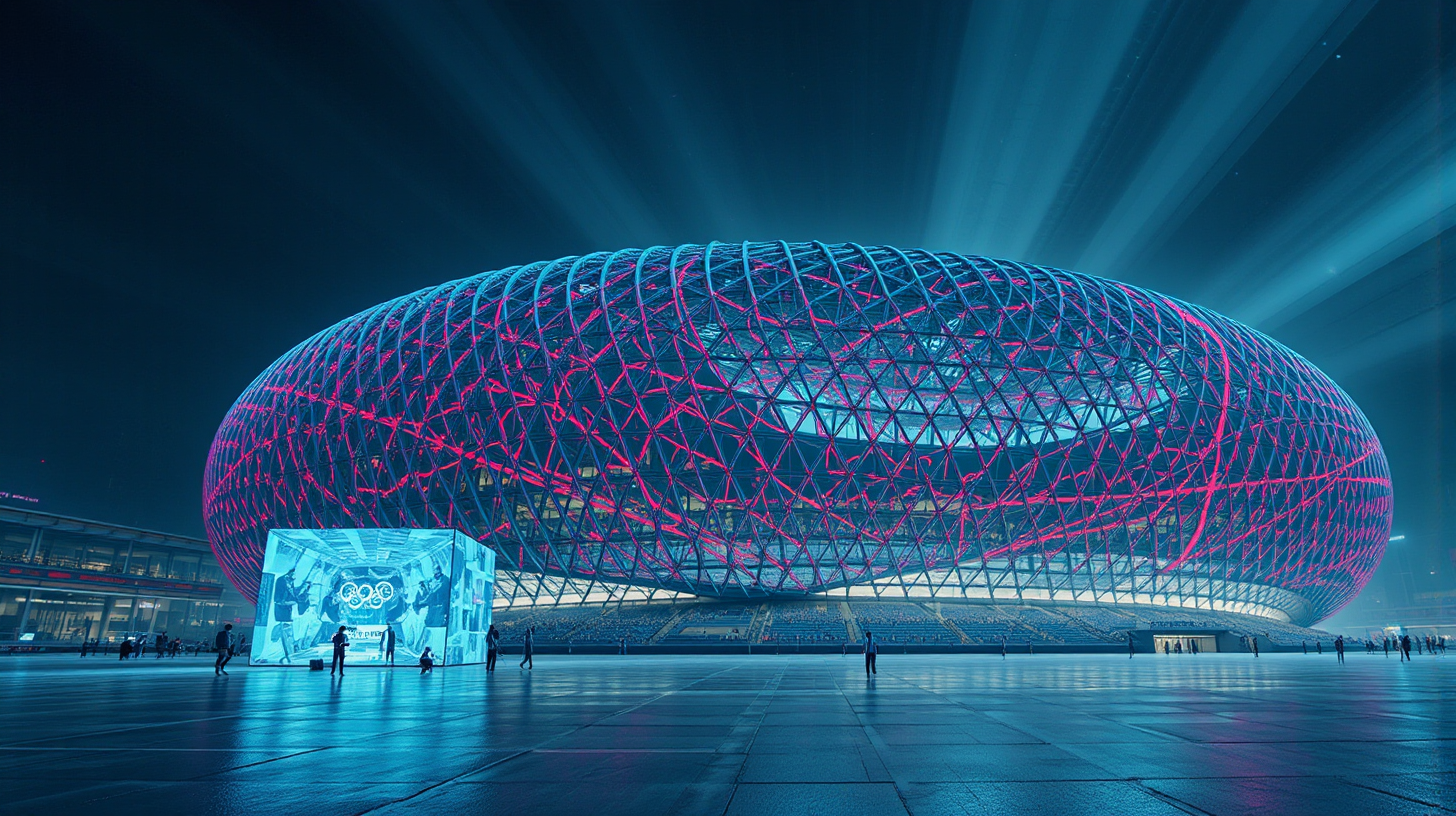 作图提示词:Beijing National Stadium (Bird’s Nest) with its iconic steel structure augmented by glowing neural networks, featuring advanced emotion resonance technology. The adjacent Ice Cube’s surface displays real-time biometric visualizations. Shot from dynamic side angle with leading lines emphasizing structural curves, highlighting futuristic sports technology. Dramatic lighting contrasts vibrant red neural pathways against cool blue steel, rendered with ultra-high detail and realistic sci-fi atmosphere.