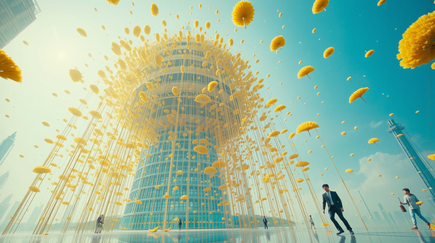 描述:中关村的摩天楼群化作一座座透明的思维灯塔,无数金色数据流如深秋银杏叶般从高空倾泻,在楼宇间织成闪烁的光网。年轻的创客们戴着轻便的脑机接口设备,指尖在空中划出优美弧线,3D商业模型便在共享的增强空间中渐渐成型。建筑外立面的透明屏幕映着这些流动的光影,风铃般的电子音与高频谐波交织,仿佛整个街区都在为创新而吟唱。