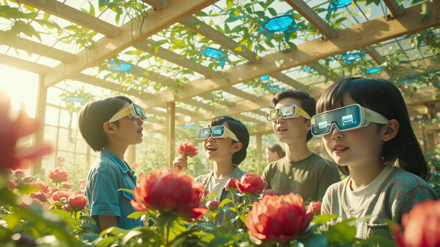 作图提示词:A futuristic vertical farm transformed from a traditional Beijing courtyard house, featuring hybrid peonies and quantum communication plants growing in harmony. Children wearing AR glasses interact with the plants, their faces illuminated by the soft glow of holographic interfaces. Warm golden sunlight filters through a transparent graphene-glass roof, casting intricate shadows of the plants on recycled wooden beams. The scene uses a medium close-up shot with shallow depth of field to focus on the children’s expressions of wonder, while vibrant colors of deep red peonies contrast against neon-blue quantum foliage. Lighting combines natural sunlight with subtle bioluminescent plant accents.