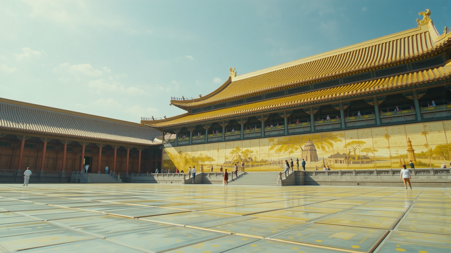 作图提示词:The Hall of Supreme Harmony in the Forbidden City protected by intelligent nanobot swarms forming shimmering golden conservation fields. Ancient glazed tiles temporarily reconfigure to display a dynamic Riverside Scene at Qingming Festival projection. Captured from dramatic low-angle perspective, contrasting majestic historical architecture with futuristic preservation technology. Cinematic lighting balances warm gold nanotech energies against cool blue historical tones, rendered with ultra-high detail showcasing 2040s conservation science.