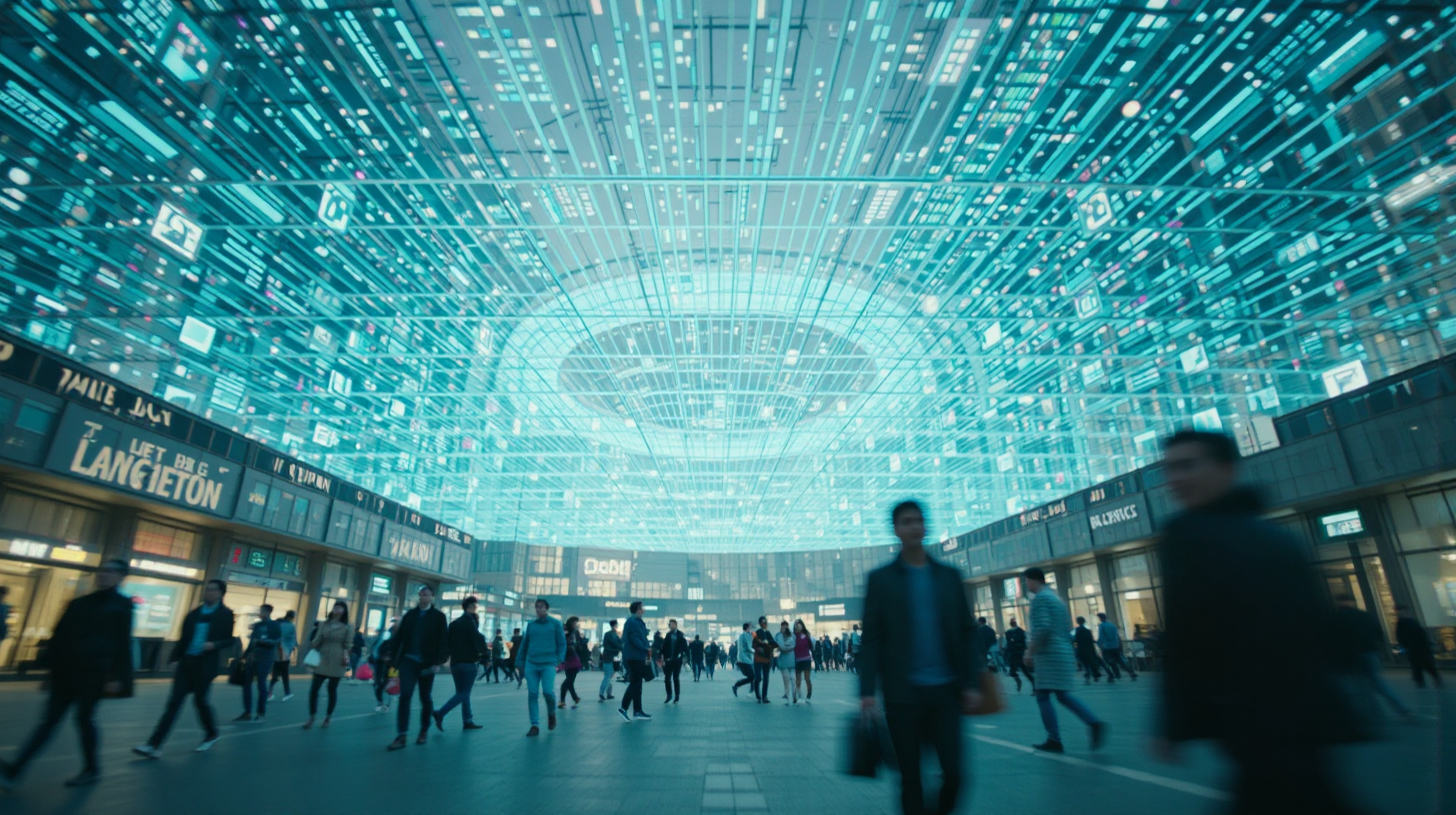 描述:暮色中的福田中心区,空中悬浮着万千条全息数据流。赤红如火焰的是商业资讯,靛蓝似深海的是科研成果,明黄像暖阳的是生活服务,它们交织成光的银河。一位老人抬手轻拨,靛蓝光带便化作一本立体古籍;孩童们追逐着赤红流光,笑声与数据的嗡鸣共振。光带时而聚成细流,在楼宇间穿梭;时而奔涌如江河,撞碎成漫天光点,知识不再被禁锢,而是化作可触可感的星河。