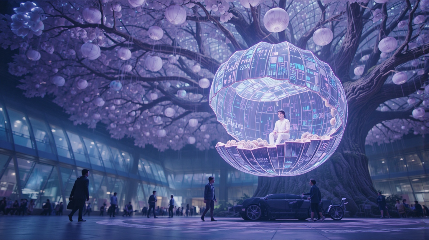 描述:深圳人才公园的中央,城市中枢树正散发着蓝紫色微光。结晶状的枝丫上,饱满的果实如星子般悬垂。其中一颗果实突然裂开,淡金色的全息图从中升起——那是跨物种翻译器的原型,数据流如叶脉般在图上流转。微风拂过,树叶发出细碎的声响,仿佛在为这个年轻的创意鼓掌。这棵树扎根于泥土,却生长着未来,每一颗果实都是城市想象力的种子,等待着破土而出的时刻。