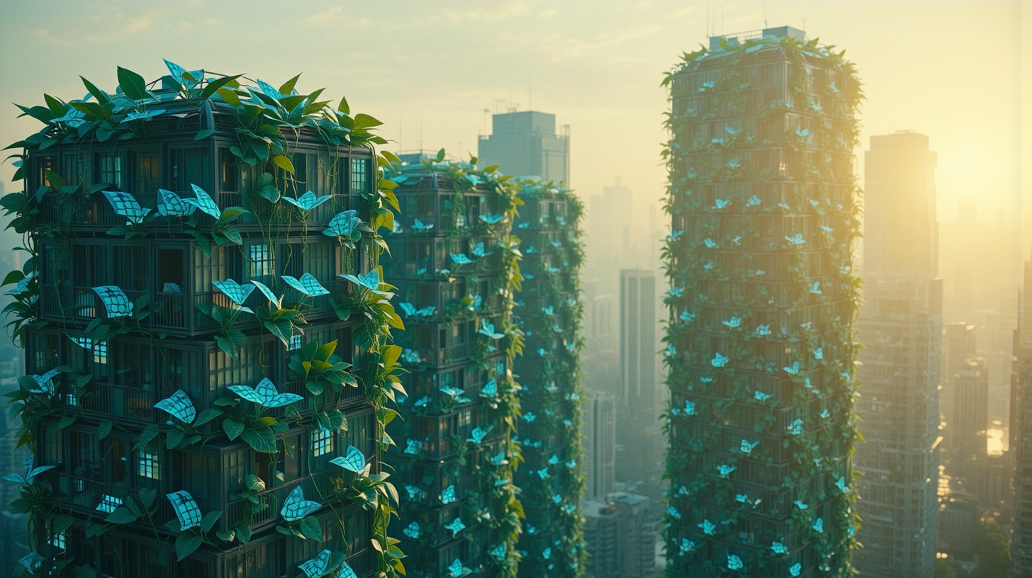描述:晨曦为深圳湾的未来主义高楼镀上金边,外立面的量子藤蔓正缓缓舒展。那些会发光的藤蔓像苏醒的精灵,一片片光伏叶片次第展开,如蝶翼般承接第一缕阳光。蓝绿色的微光从藤蔓脉络中渗出,与金色晨光交融,在玻璃幕墙上织出流动的光斑。城市刚从沉睡中睁眼,藤蔓展开的沙沙声混着远处的轻鸣,仿佛是未来之城的晨间序曲,每一片叶片都在为城市注入新生的能量。