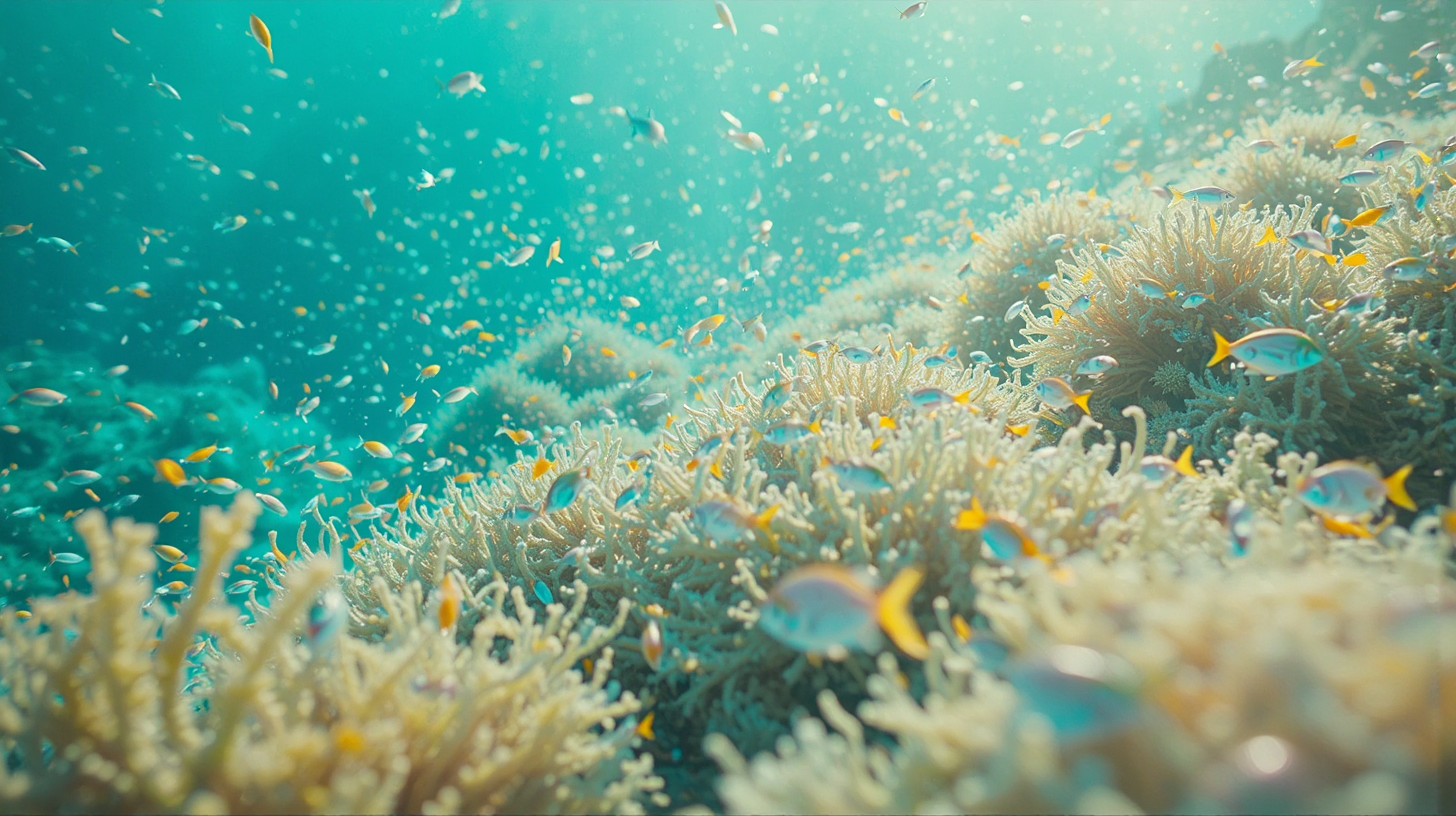 描述:大鹏半岛的海岸被阳光镀上金边,海水泛着绿松石般的光泽。修复后的珊瑚礁在水中呼吸,荧光珊瑚与真实珊瑚依偎共生。一群光子鱼从礁岩中游出,蓝光尾鳍划过水面,与金黄的真实鱼群交织成螺旋。微型无人机群在水面掠过,留下淡淡的光轨,每修复一片珊瑚,便有新的光子鱼加入这场舞蹈。科技不再是自然的对立面,而是化作温柔的画笔,为海洋重新上色。