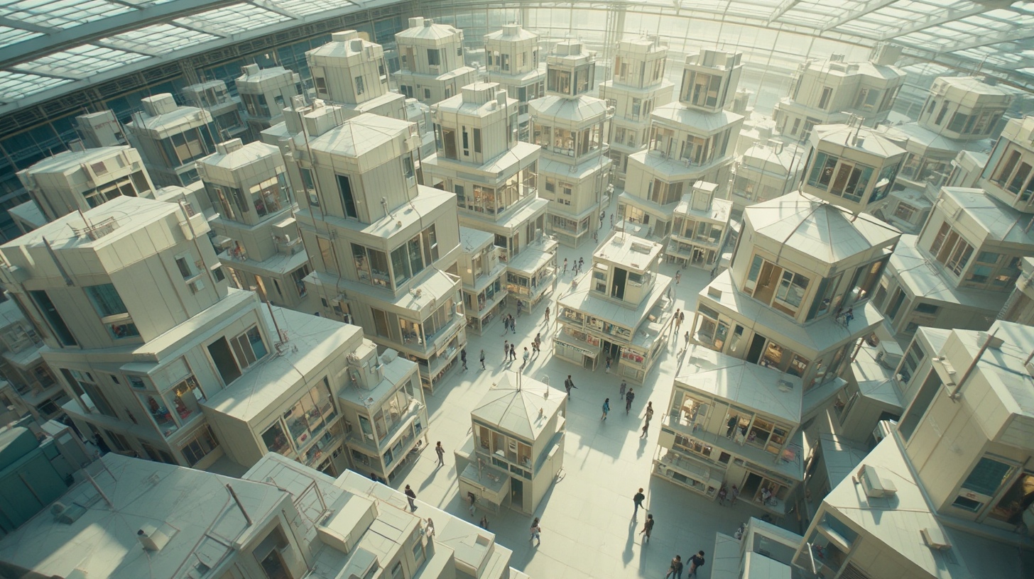 描述:正午的华强北,立体市集正上演一场无声的机械芭蕾。模块化建筑在磁悬浮的牵引下缓缓移动,菱形摊位旋转变为环形展台,方形货柜升起成悬浮货架。阳光透过模块的几何缝隙,在地面投下跳动的光斑。模块重组的咔嗒声与商家的招呼声交织,刚还是纳米材料展的区域,转瞬间便化作3D打印工坊,连空气里都飘着创新的节奏。这座市集不再是固定的场所,而是随需求起舞的城市魔方。