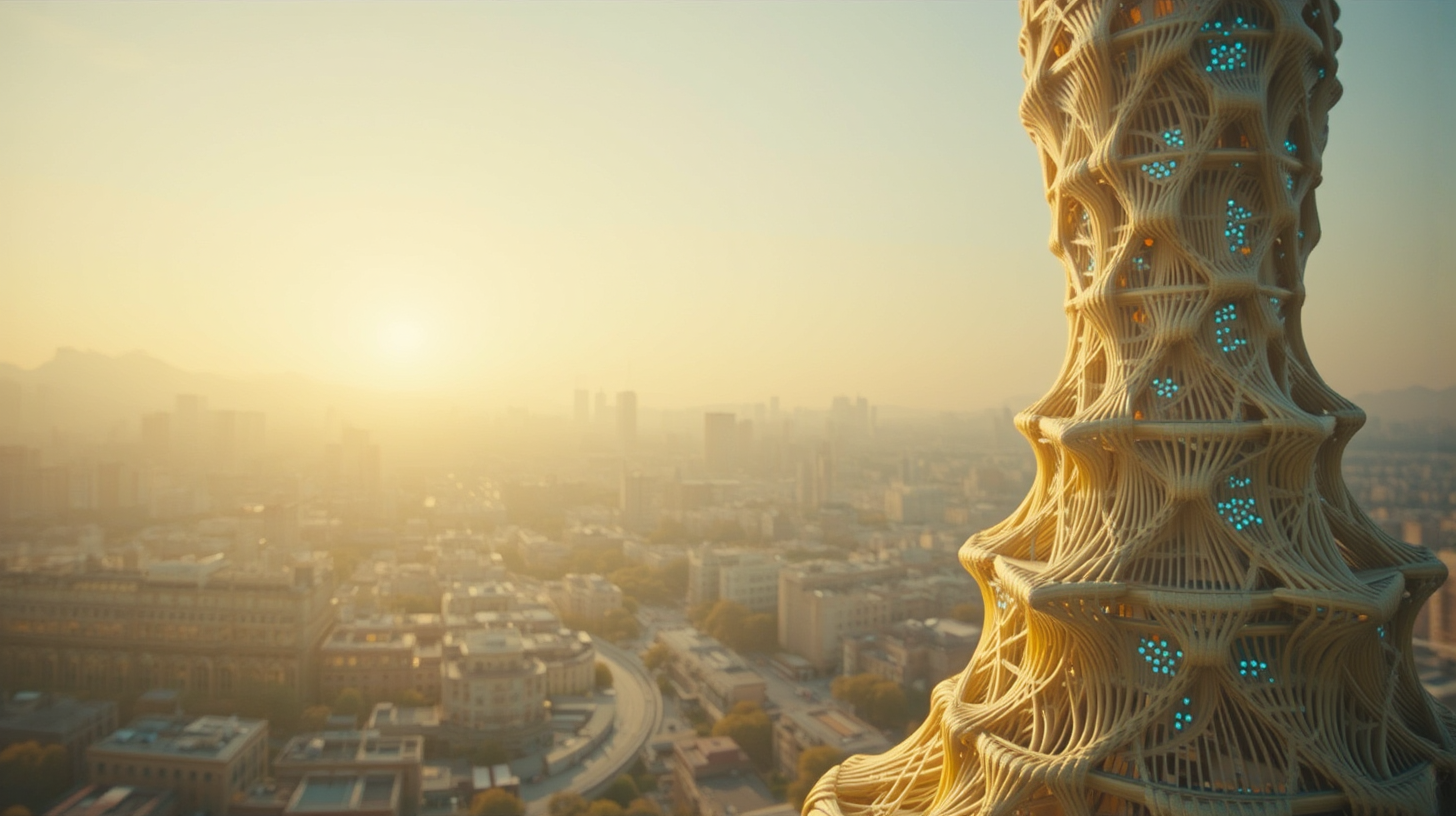 作图提示词:A towering quantum textile spire in 2080s Shijiazhuang, where nanofiber looms weave glowing silk with embedded quantum circuits, creating dynamic patterns that shift with atmospheric conditions. Shot with tilt-shift perspective at dawn, emphasizing the golden light raking across fractal-inspired architectural surfaces, with deep focus from the intricate base details to the distant city skyline. Color grading emphasizes the contrast between warm traditional golds and cool quantum blues.