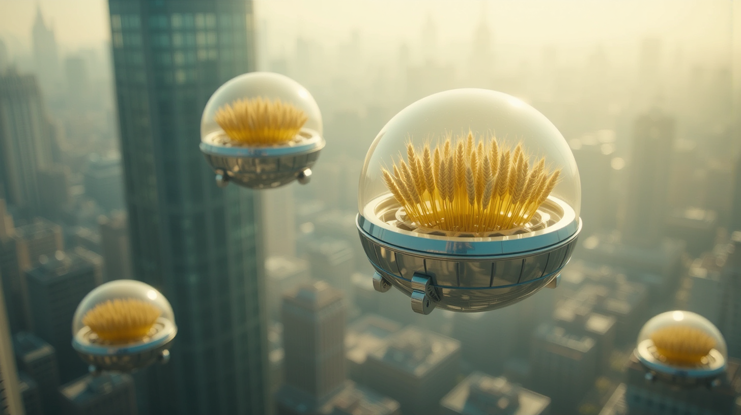 作图提示词:Anti-gravity cultivation spheres hovering above 2090 Shijiazhuang, containing genetically optimized wheat strains. Photorealistic rendering with shallow depth of field focusing on individual golden stalks against the blurred cityscape, using directional morning light to create glowing halos around each pod. Color palette balances organic amber crops with polished titanium machinery.