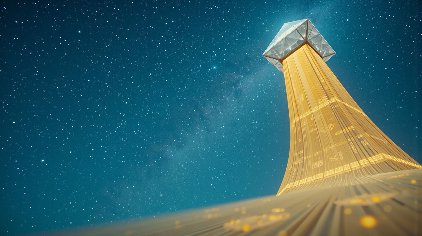 作图提示词:A monumental quantum textile spire in 22nd century Shijiazhuang, its crystalline apex containing a photon loom that harvests celestial energy. Shot from a dramatic low-angle perspective (24mm wide-angle) to emphasize the tower’s soaring verticality against the Milky Way. The composition uses the rule of thirds to position the energy fabric cascading down the right side. Lighting features cool lunar blues contrasting with the warm bioluminescence of the woven photonic textiles. The scene reinterprets traditional Chinese weaving techniques through quantum technology, with intricate energy patterns resembling ancient silk motifs. Depth of field is carefully controlled to keep both the starfield and fabric details in sharp focus.