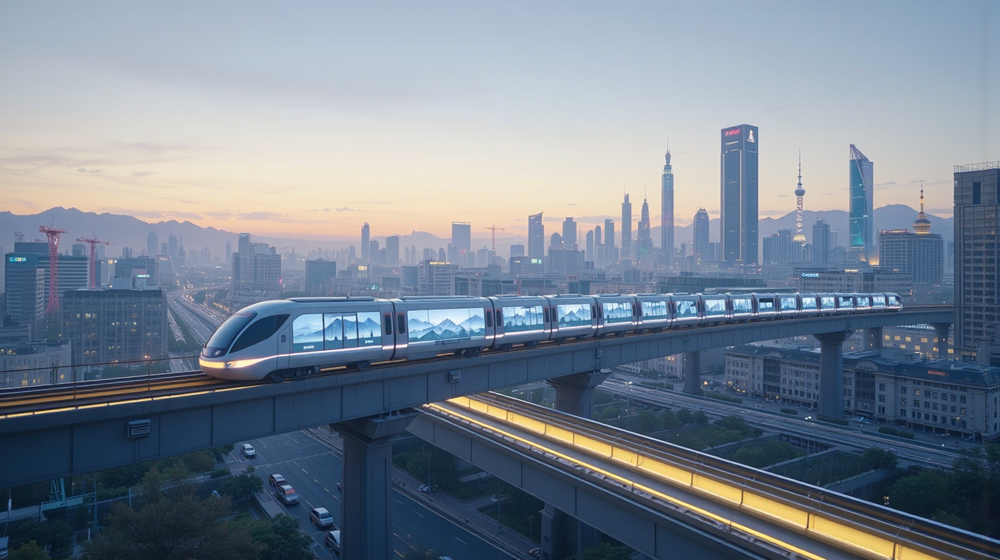 描述:黄昏的石家庄,光轨交通系统如活物般苏醒。生物发光轨道从暖琥珀色渐变为治愈 azure 蓝,流线型车厢泛着柔光,顶部投影将太行山的苍茫影像投在透明壁上。85mm镜头压缩了城市背景,薰衣草色的体积光笼罩着轨道,新未来主义建筑与中式屋檐在远处交融。光轨运行的轻嗡、投影切换的微响与城市喧嚣交织,让每个乘客都能在流动的光影中,触摸到城市与自然共生的温柔脉搏。