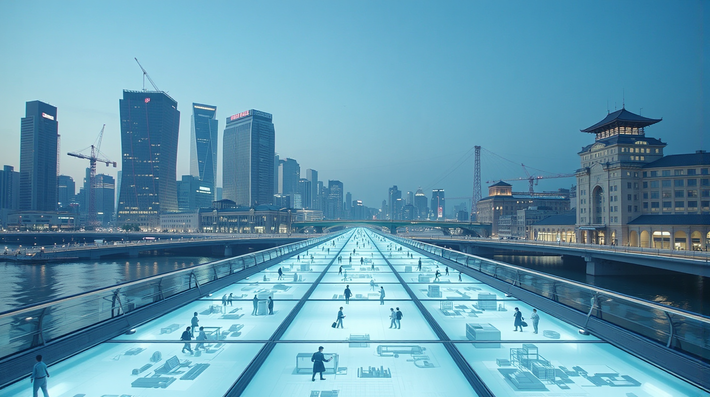 作图提示词:The Hutuo River Memory Bridge in 2085, its smart glass deck activating augmented reality reconstructions of Shijiazhuang’s textile history when stepped upon. Shot at blue hour with long exposure to capture the physical LED pathways, using a symmetrical composition to frame the bridge between modern skyscrapers and preserved industrial landmarks.