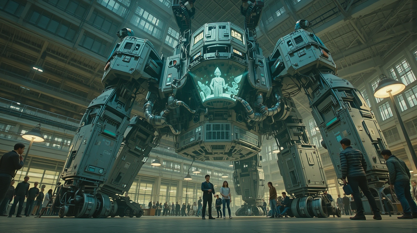 作图提示词:A dramatic low-angle shot of a massive industrial mecha in a public square, its form clearly evolved from repurposed machine tools with visible hydraulic systems and structural elements. Holographic projections of Tiexi’s history emanate realistically from emitter arrays embedded in its frame rather than its eyes. Young engineers install quantum-printed components that cause organic patterns to spread gradually across metal surfaces. Lighting combines practical industrial lamps with the mecha’s own projection systems (shot at f/11 for deep focus), creating a dynamic interplay of cool metallic grays and warm organic tones, with careful attention to realistic material textures and light interactions.