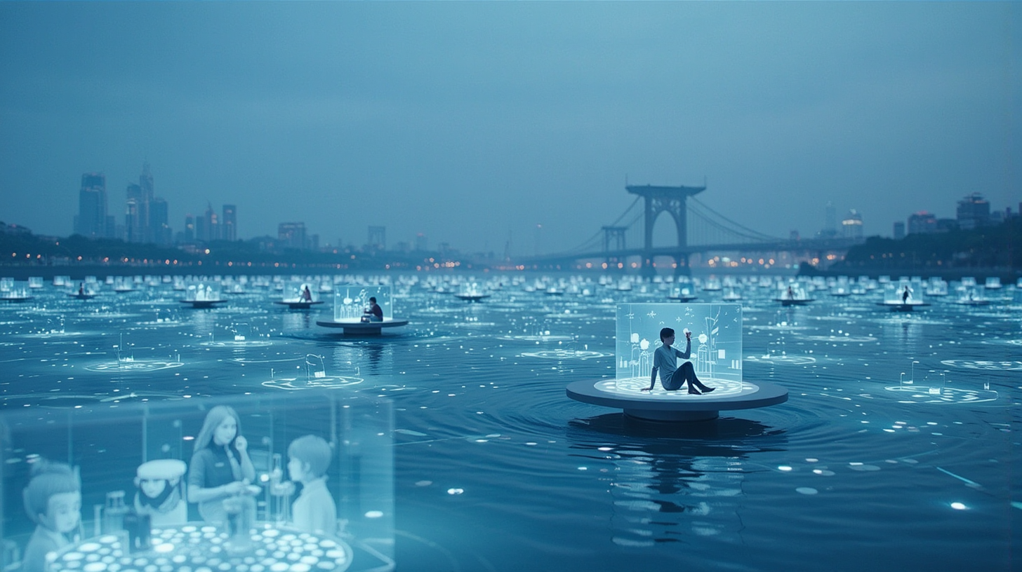 描述:暮色为浑河披上深蓝的纱衣,水面却像打翻了星子的匣子,无数发光的诗句碎片随波轻晃。市民们踩着磁悬浮踏板掠过水面,踏板激起的涟漪将碎片轻轻推向彼此。有人伸手接住一片“塔影横江”,有人拾起半阙“柳塘避暑”,当最后一块碎片嵌入拼图,河面突然腾起全息的光雾,盛京八景如活过来般在雾中流转——太清宫的香火混着晨光,西塔的风铃响在耳畔,让人心头泛起历史与当下碰撞的微澜。
