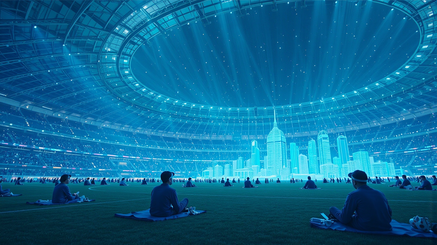 作图提示词:A futuristic Shenyang Olympic Stadium at night, its dome transformed into a glowing quantum observatory ring. Citizens wearing biofeedback headbands recline on the field, their collective data streams generating a holographic projection of Shenyang’s urban development plan. The scene is illuminated by shifting blue and violet quantum lighting, with luminous particles drifting through the air. Shot with a wide-angle lens from ground level, capturing both the star-ring structure and floating hologram, using long exposure to create light trails. Color palette emphasizes cool tones with neon accents.