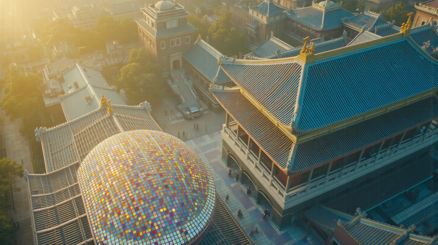 作图提示词:A breathtaking aerial view of Shenyang Imperial Palace at dawn, with quantum-enhanced glazed tiles shimmering in a dynamic color spectrum, their surfaces subtly shifting hues with the morning light. The ancient architecture maintains its traditional form while being gently augmented by barely visible nano-preservation fields. Soft golden hour lighting bathes the scene with a vibrant palette of blues, golds, and purples, creating a harmonious blend of history and future technology. Shot with a high-angle drone perspective, f/8 aperture for sharp detail throughout, using warm color grading with enhanced saturation for the quantum light effects.