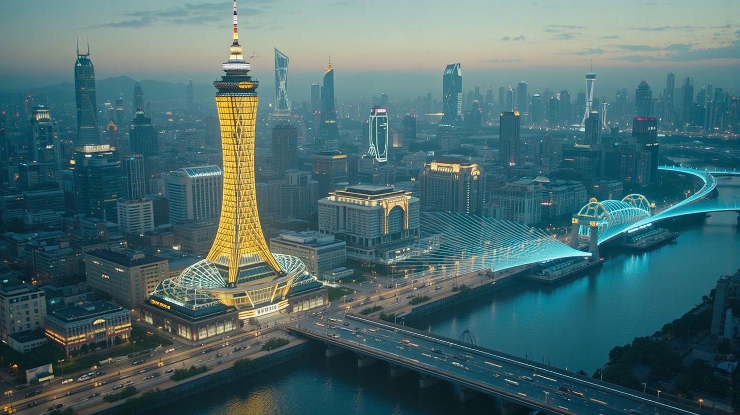 作图提示词:An aerial dawn view of Shenyang with buildings featuring synchronized lighting systems. The TV Tower emits dynamic light patterns that harmonize with Shenyang Palace’s illumination and the riverside light installations. The cityscape glows in the morning light, with gold and blue light trails connecting architectural landmarks. Captured with a high-resolution drone camera using HDR techniques to balance the bright light sources with shadow details. Composition follows the rule of thirds with the TV Tower as focal point, using shallow depth-of-field to emphasize foreground elements while keeping the background slightly blurred.