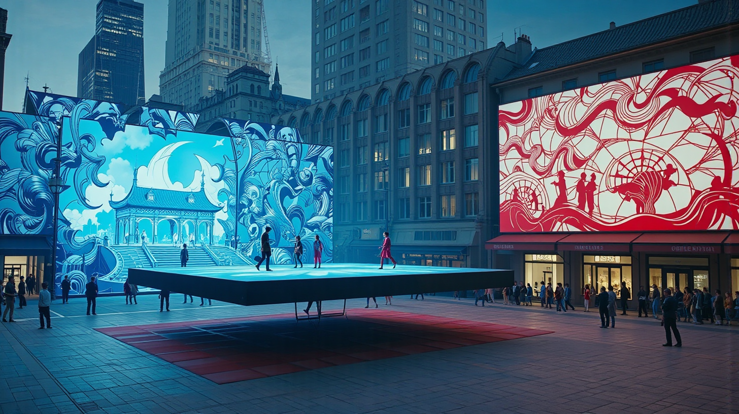 作图提示词:Horizontal view of a magnetic levitation stage in city square, holographic projections intertwining with traditional shadow puppetry on semi-transparent screens, dynamic metal reliefs on surrounding buildings pulsing with liquid-like movements, blue glow from floating platform, ultra-realistic light play, vibrant red and blue color contrast, showcasing a futuristic cultural fusion with modern technology and traditional art forms.