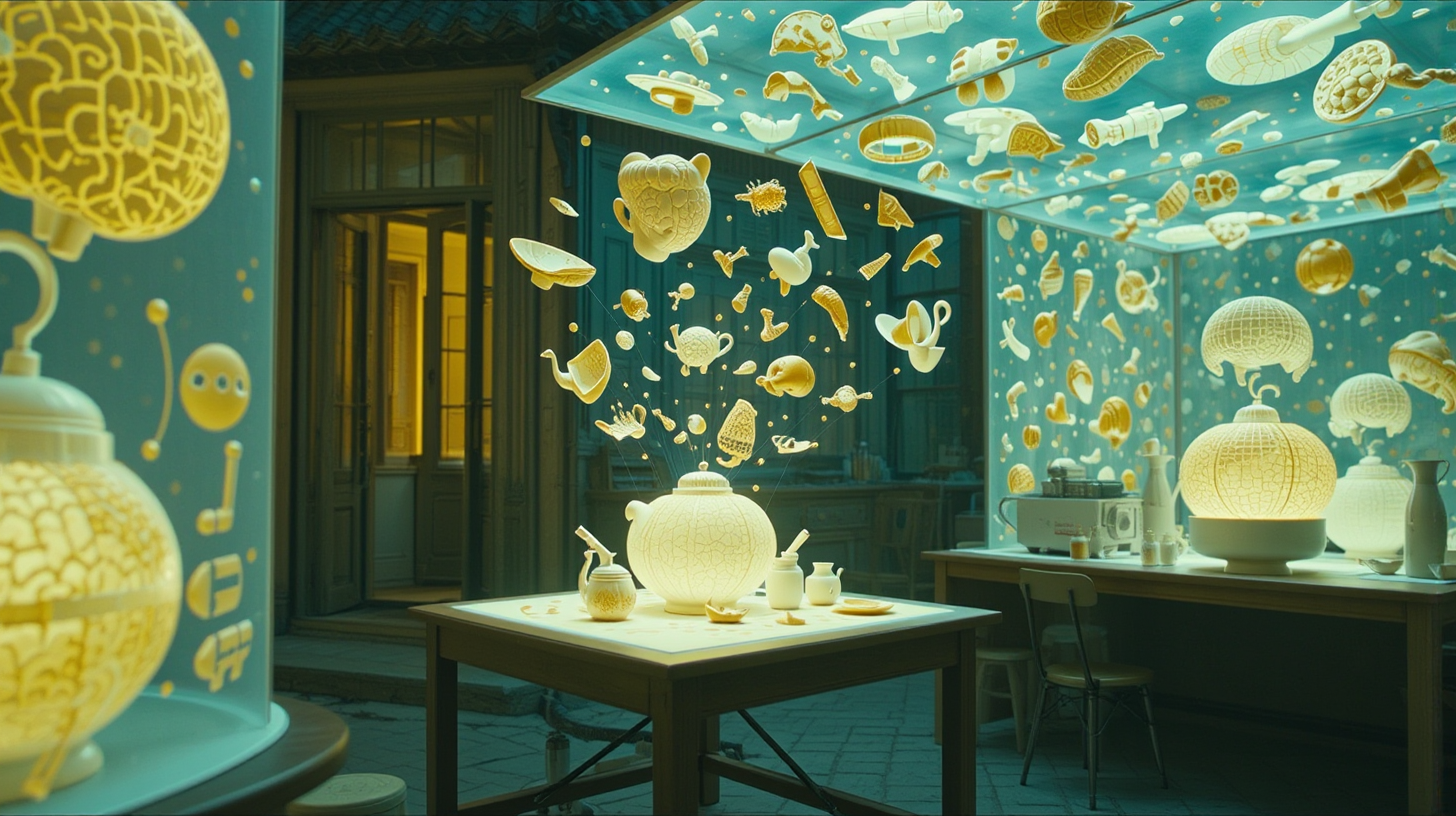 作图提示词:45-degree angle shot of a light-etching studio in old neighborhood, translucent intelligent porcelain glowing with golden neural patterns under UV light, holographic interfaces displaying molecular structures of bone china, floating projections of historical ceramic fragments forming a constellation around new creations, ultra-detailed close-up, warm golden and white color scheme, illustrating the fusion of traditional ceramic craftsmanship with cutting-edge 3D light-etching technology.