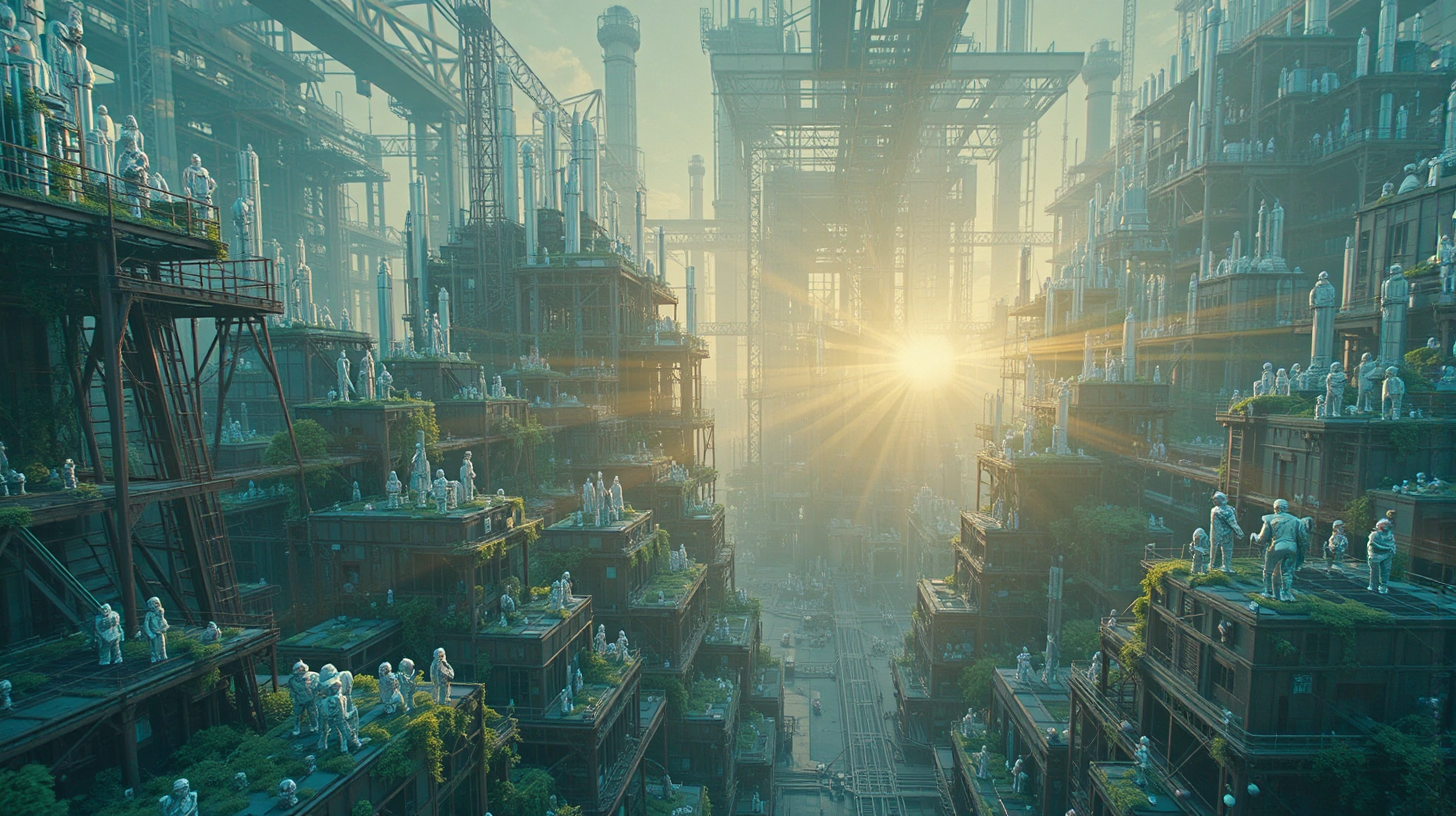 故事发生在中国唐山,这座曾历经工业辉煌与地震创伤的城市,正上演着一场工业遗产与未来科技的奇妙融合。量子苔藓覆盖钢铁厂废墟,纳米机器人将锈蚀高炉化为发光生态雕塑;磁悬浮剧场里,全息投影与传统皮影共舞,儿童笑声唤醒建筑浮雕;矿洞变身为地热音乐厅,岩柱共振奏响地质韵律;老街区中,3D光刻技术让骨质瓷技艺重生,碎瓷片重组为智能气候器皿;退役龙门吊化作跨河光能装置,雾霾中投射七彩光谱;城市中心的记忆合金凤凰羽翼,随居民心愿生长,夕阳下展开千米希望投影。