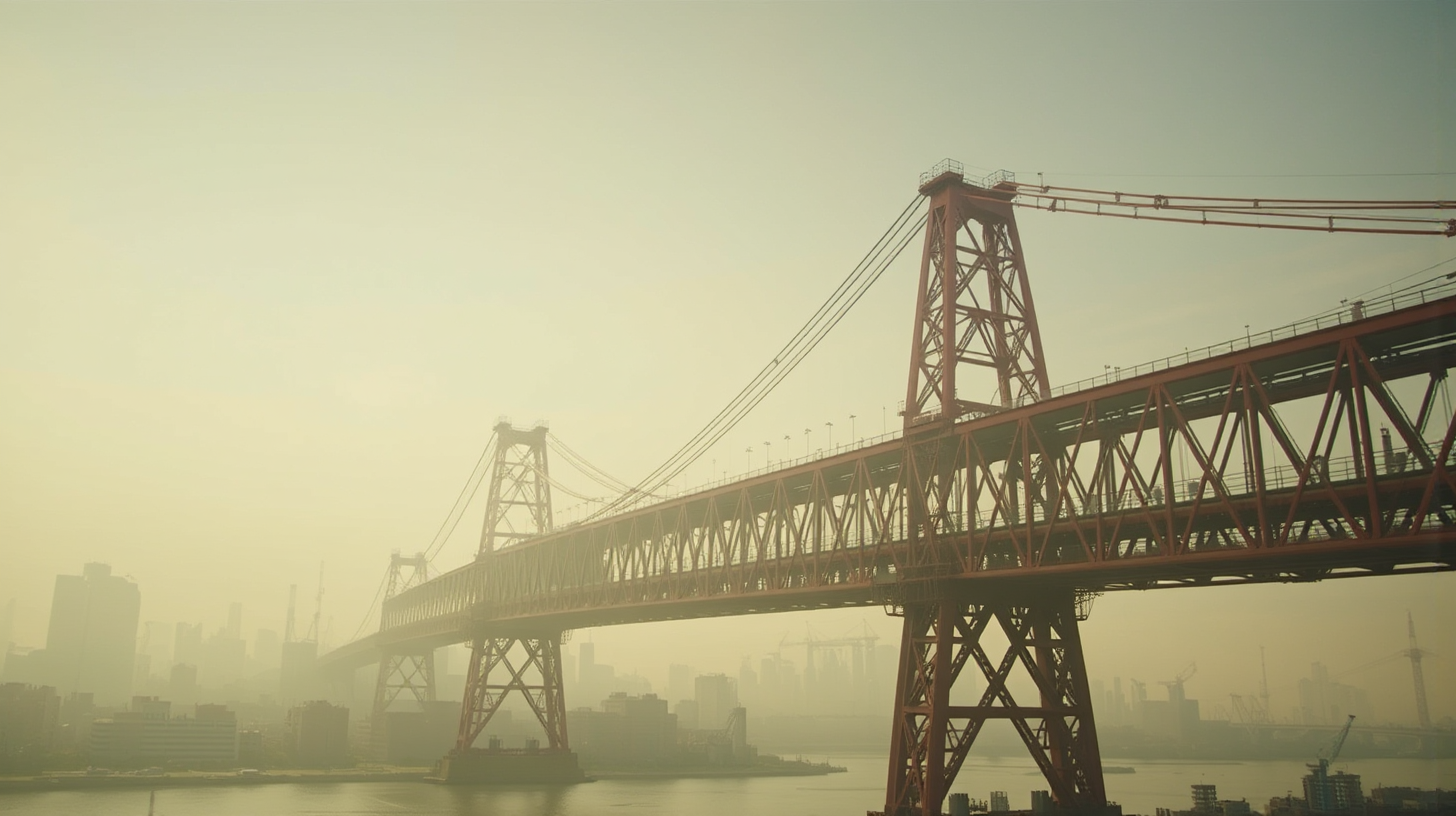 作图提示词:A massive retrofitted gantry crane spanning the Dou River in modern-day Tangshan, composed of mirror-refracting panels forming a giant prism array. The retired red gantry crane is fitted with thousands of smart prisms, cutting clear seven-colored light paths through the yellowish-gray haze, like a crystal necklace for the city. Industrial megastructure and natural light form a surreal harmony. The scene captures spectral bands gradually becoming clear in the haze, showing the healing process of light penetrating polluted air. The smart refraction system calibrates light paths in the haze, projecting spectral bands across the city. Long focal compression, dramatic backlighting with high dynamic range, emphasizing the contrast between industrial structure and ethereal light beams. Shot with a telephoto lens to compress perspective, enhancing the visual impact of the light paths through atmospheric haze.